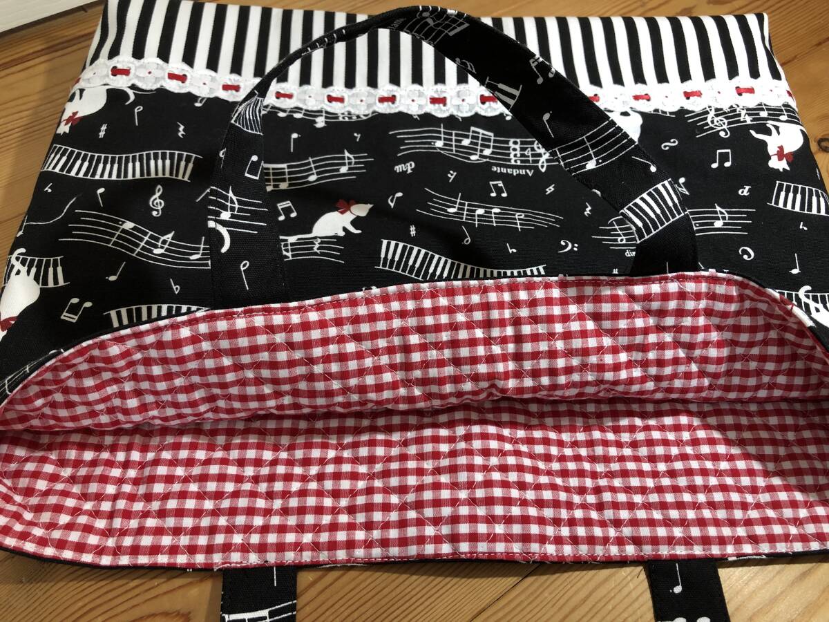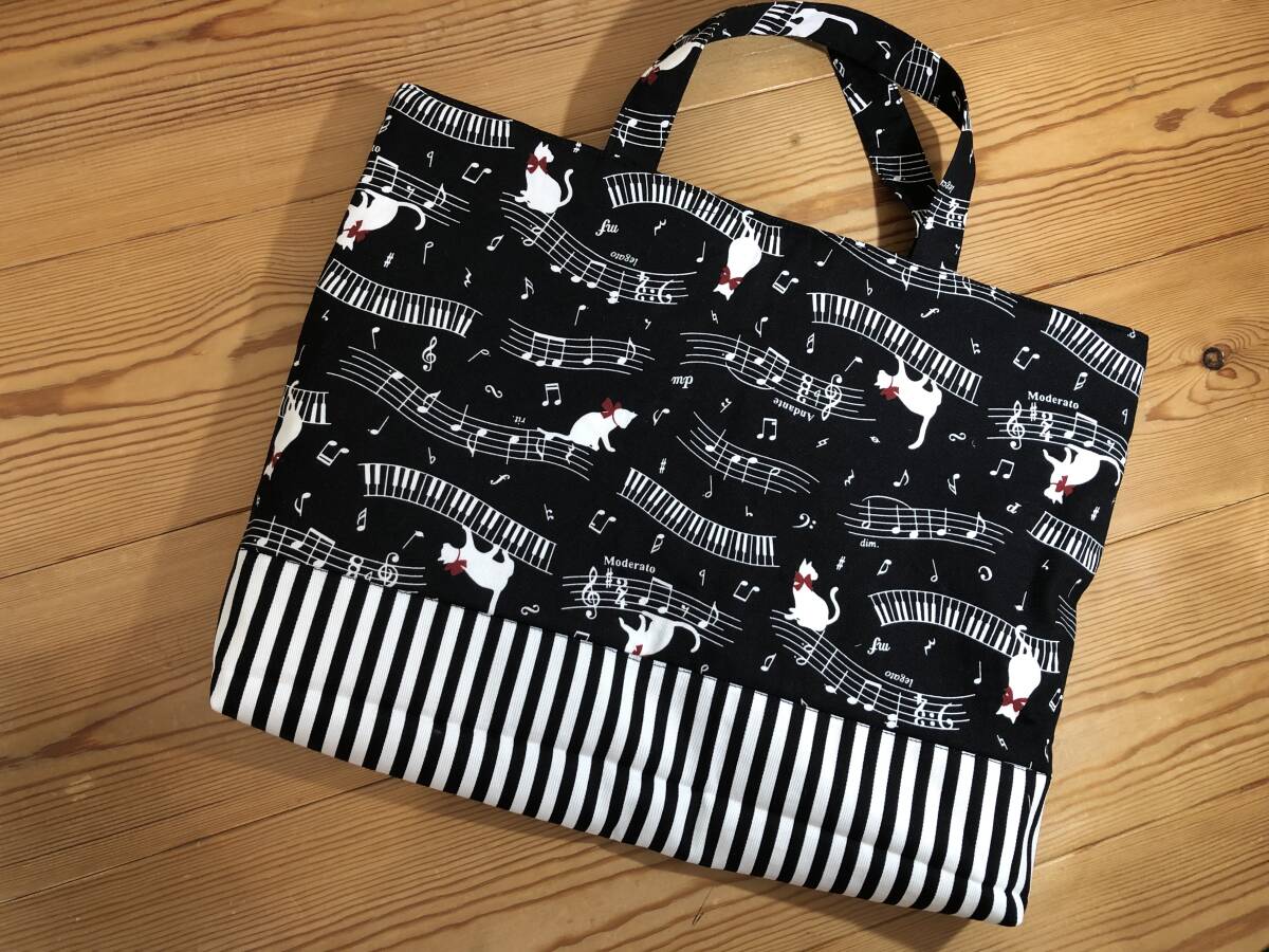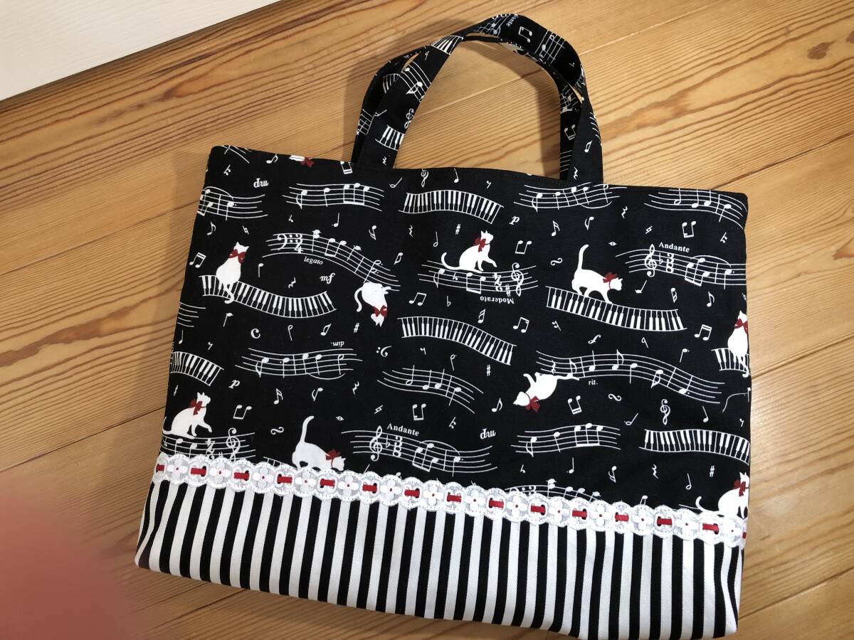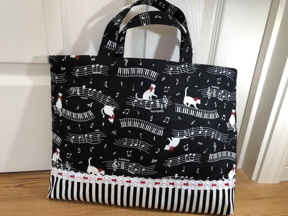 可愛いねこ協奏曲柄生地(オックス)に切り替えで白黒のストライプを使用したレッスンバックになります。