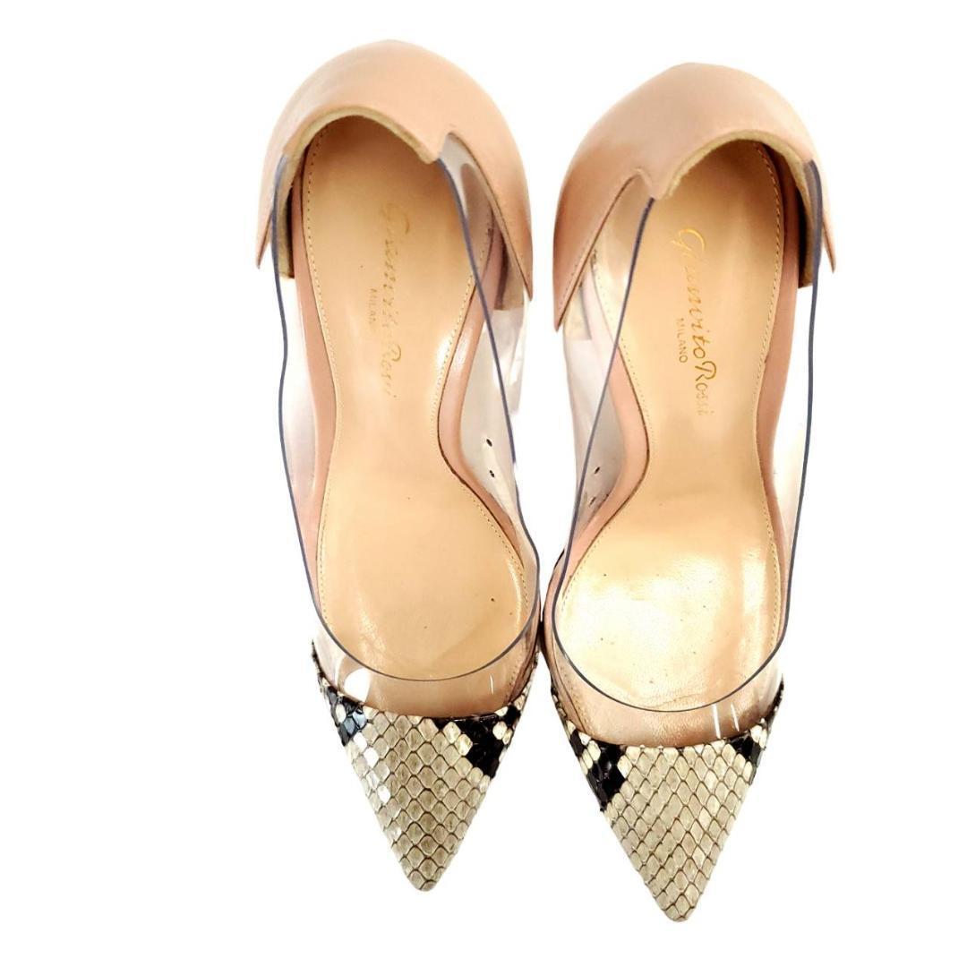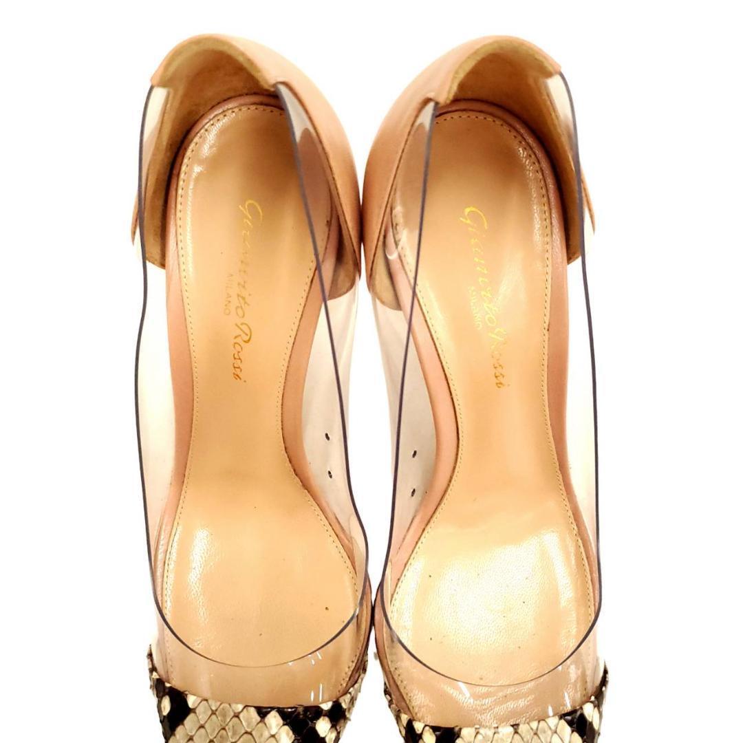 ヌードカラーとパイソン柄、そしてクリア素材の組み合わせがとても洗練されていて、足元を美しく演出してくれます。