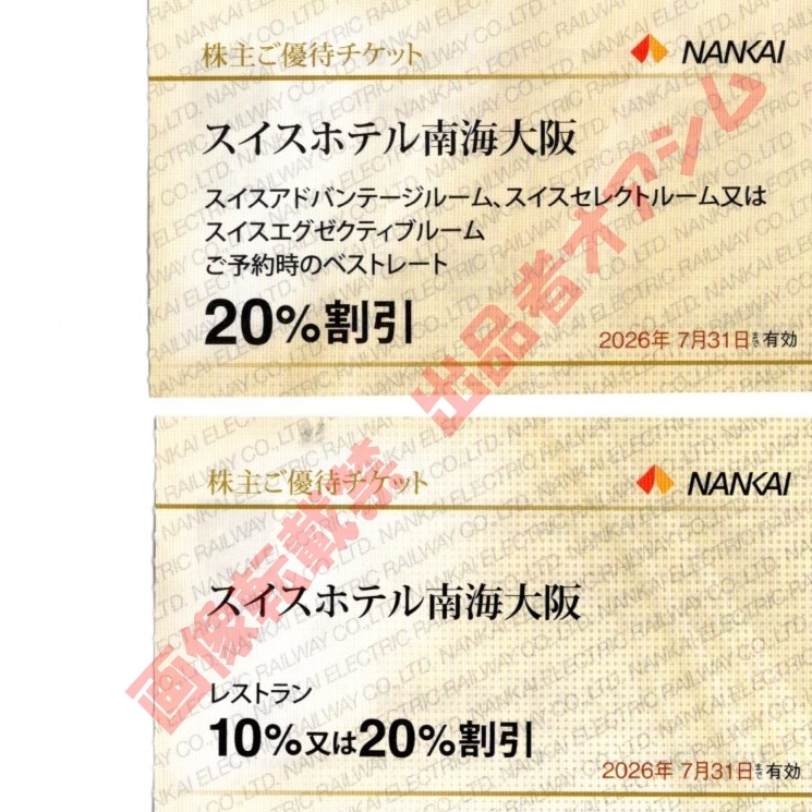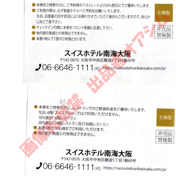 スイスホテル南海大阪20%割引券1枚+スイスホテルレストラン割引券1枚
