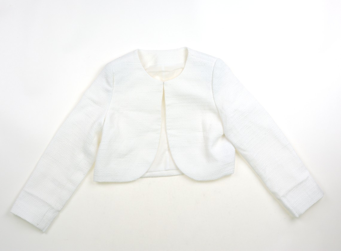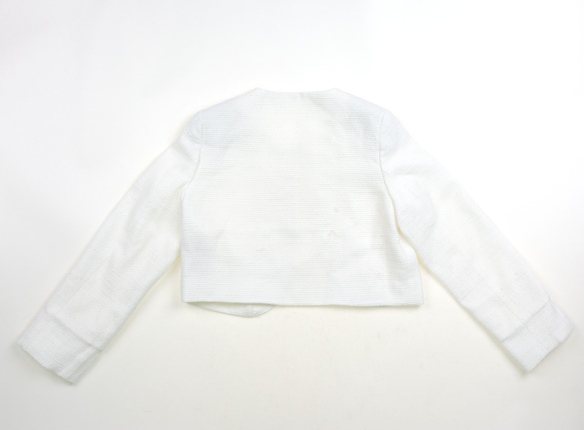 ポケットなし、 肩パッドあり、 裏地あり。 素材はポリエステル、レーヨン、ナイロンです。 透明の光る刺繍糸が入っています。袖に折跡あり。右二の腕あたりにオレンジのシミ、背中に複数糸の引っ掛け傷がありますが穴は開いていません。