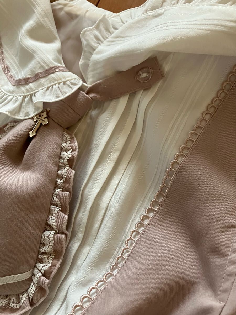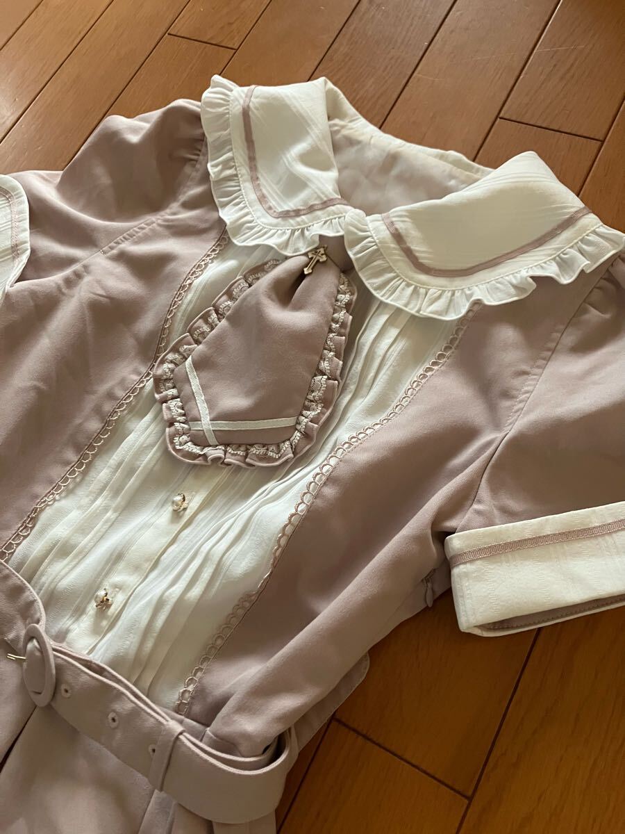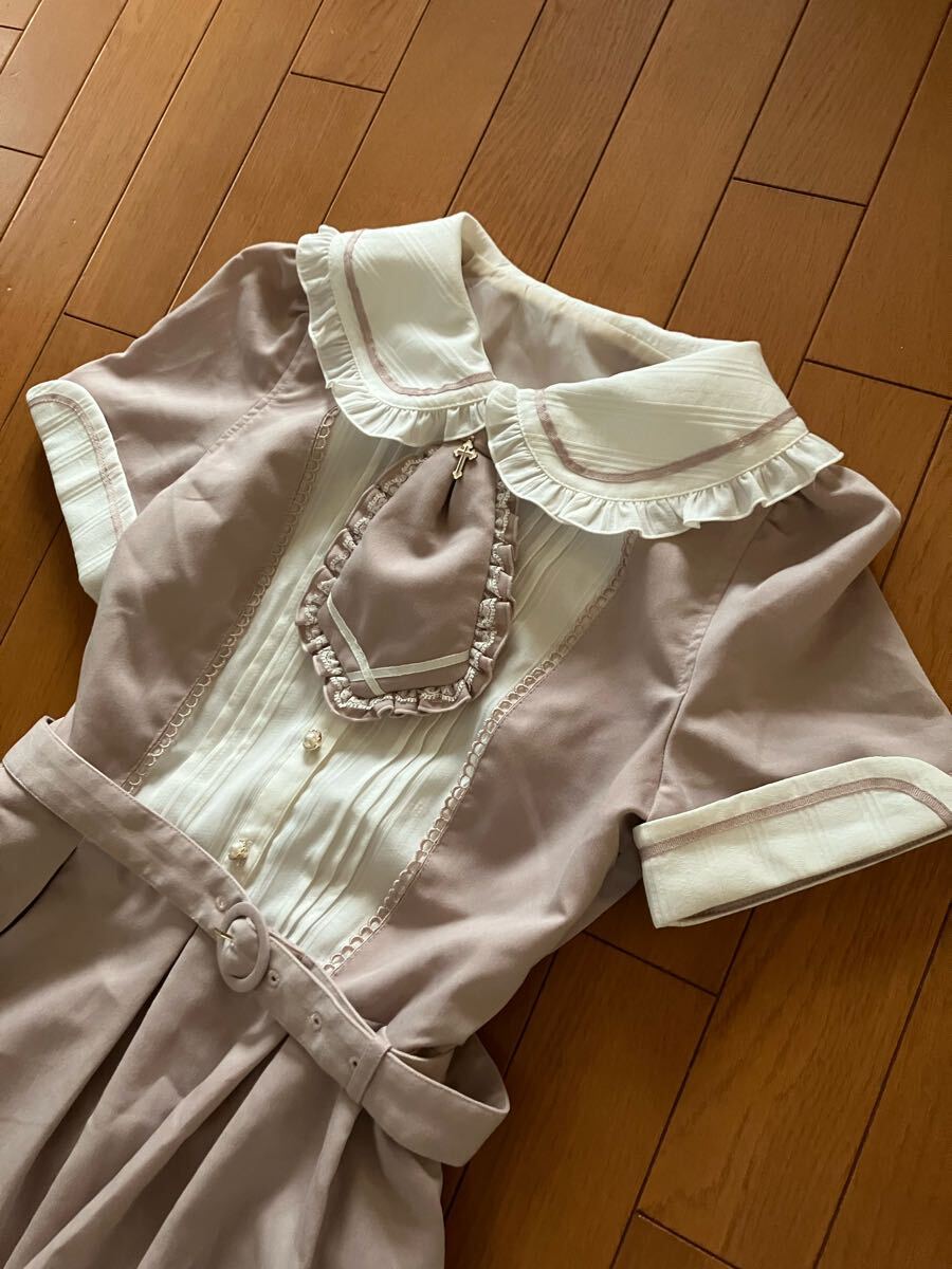 3枚目の色味です。襟と袖、胸元に白い装飾があり、ウエストには共布のベルトが付いています。ネクタイ、ベルトは、取り外し可能です。