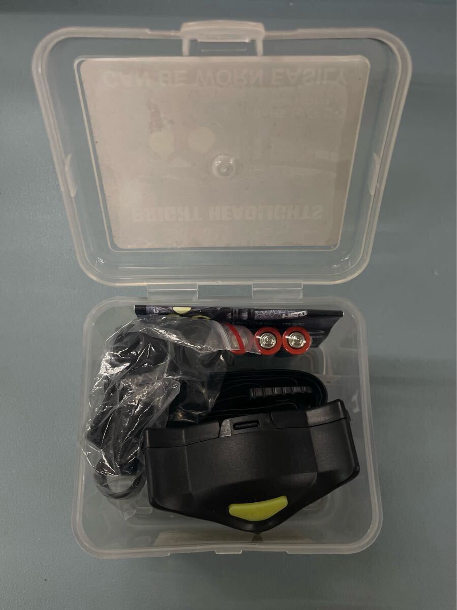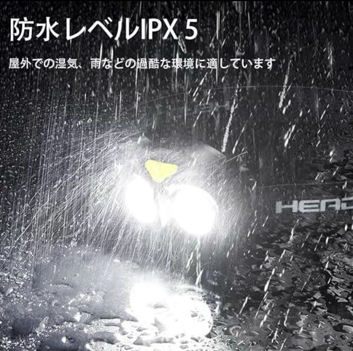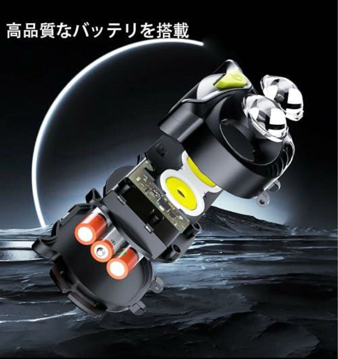 超高輝度LEDヘッドライト、4つの照明モード搭載、AAA乾電池3本使用。