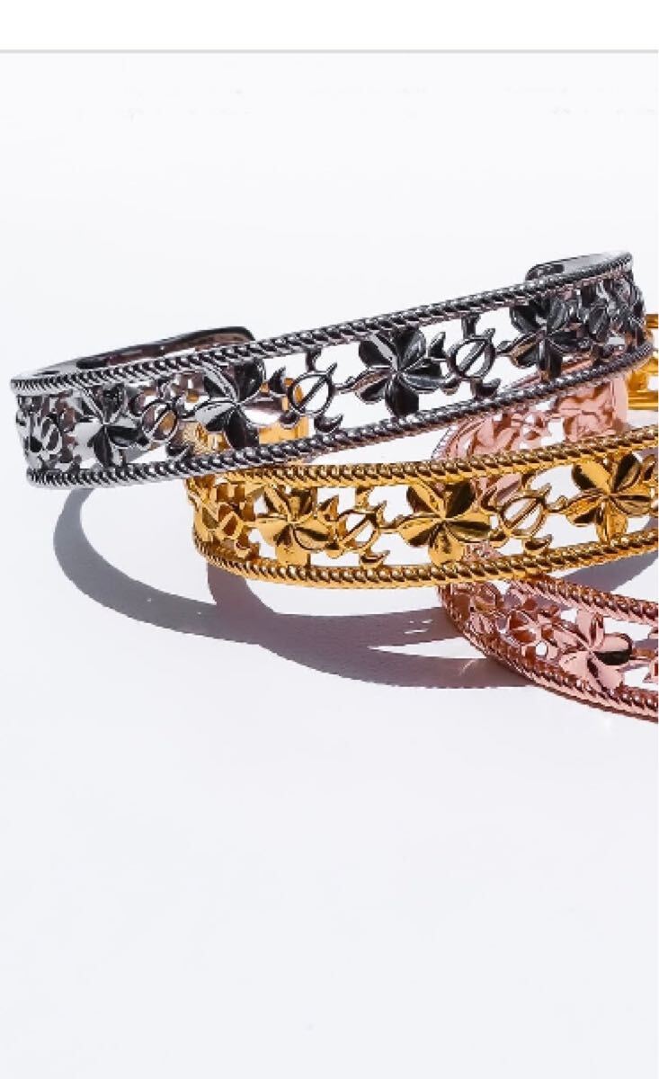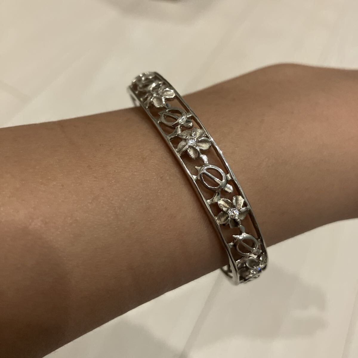 ハワイの自然を感じさせる「ホヌ(海亀)」と「プルメリア」のモチーフを繊細な透かしデザインで仕上げたバングル。