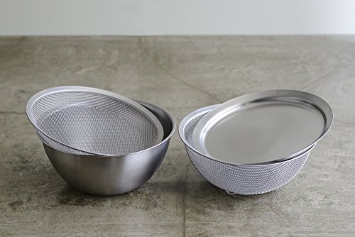 説明 野菜類の下処理、麺類の湯切りなどに便利なサイズです。 同サイズのボウル、プレートと組み合わせると、使い方が広がります。 野菜の養生の一連の作業に欠かせない道具です。 もやしや豆苗を育てることにも活用できます。 足付きなので、調理台から少し浮いて清潔を保てますし、ボウルの縁に足を引っ掛けると更に早く水切りができます。 ・サイズは大(27cm)、中(21cm)、小(15cm)の3種類。 ・「綾織」は従来のざるより丈夫で、水の膜ができにくいので、水切れが格段に良いです。パンチング材のざると比べものになりません。 ・縁は一枚のステンレス板をくり抜いて作ったので、つなぎ目がなく洗いやすいです。 ・同サイズのボウルと重ねた時、ざるを手早く持ち上げることができるよう隙間ができる設計にしています。 ・持った時、手にフィットするように縁まわりは内側に傾斜がついた設計となっています。