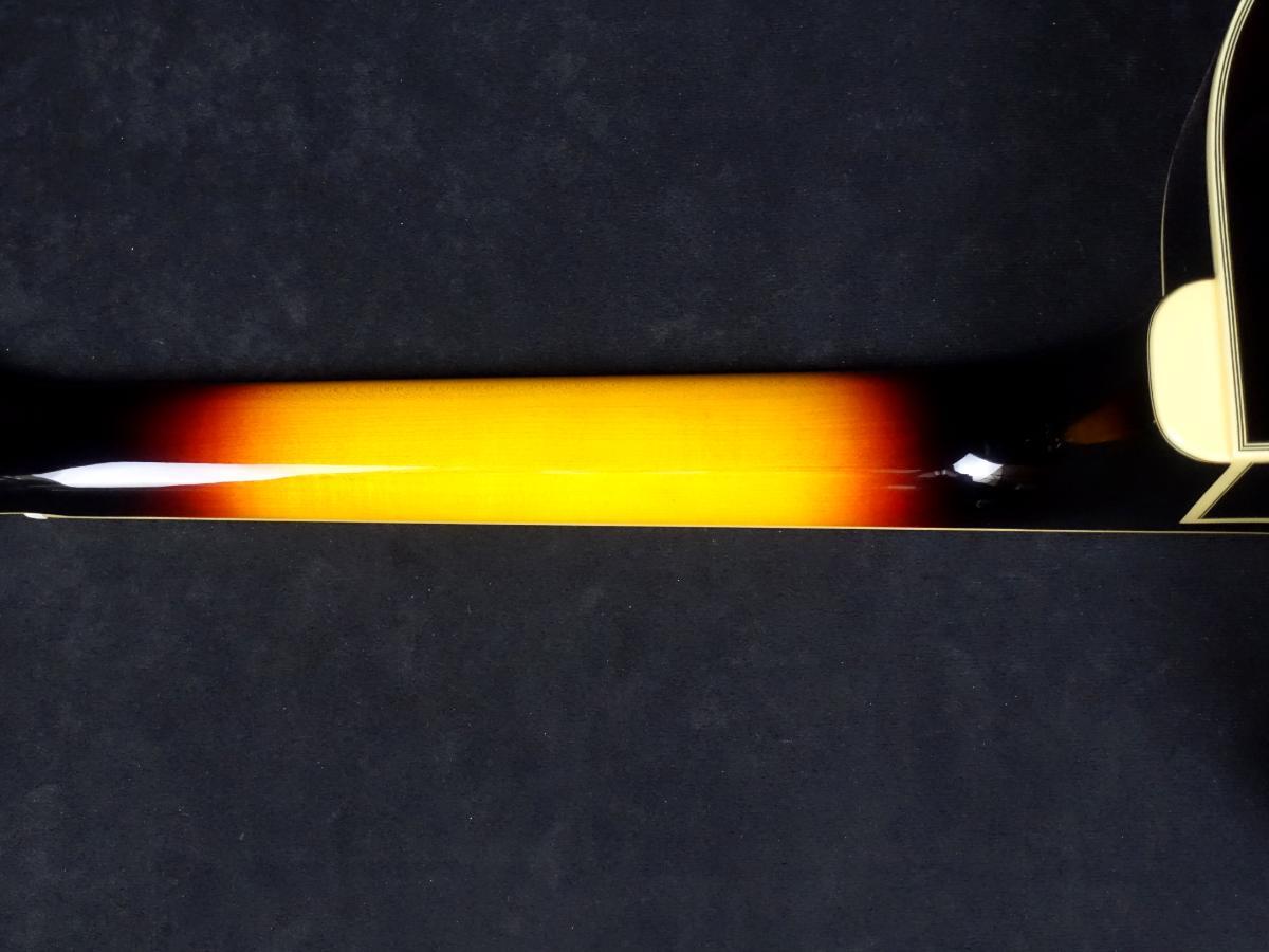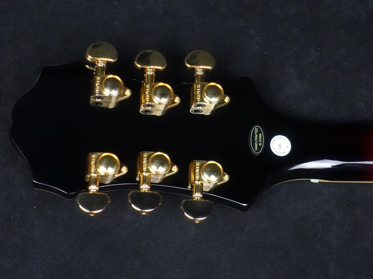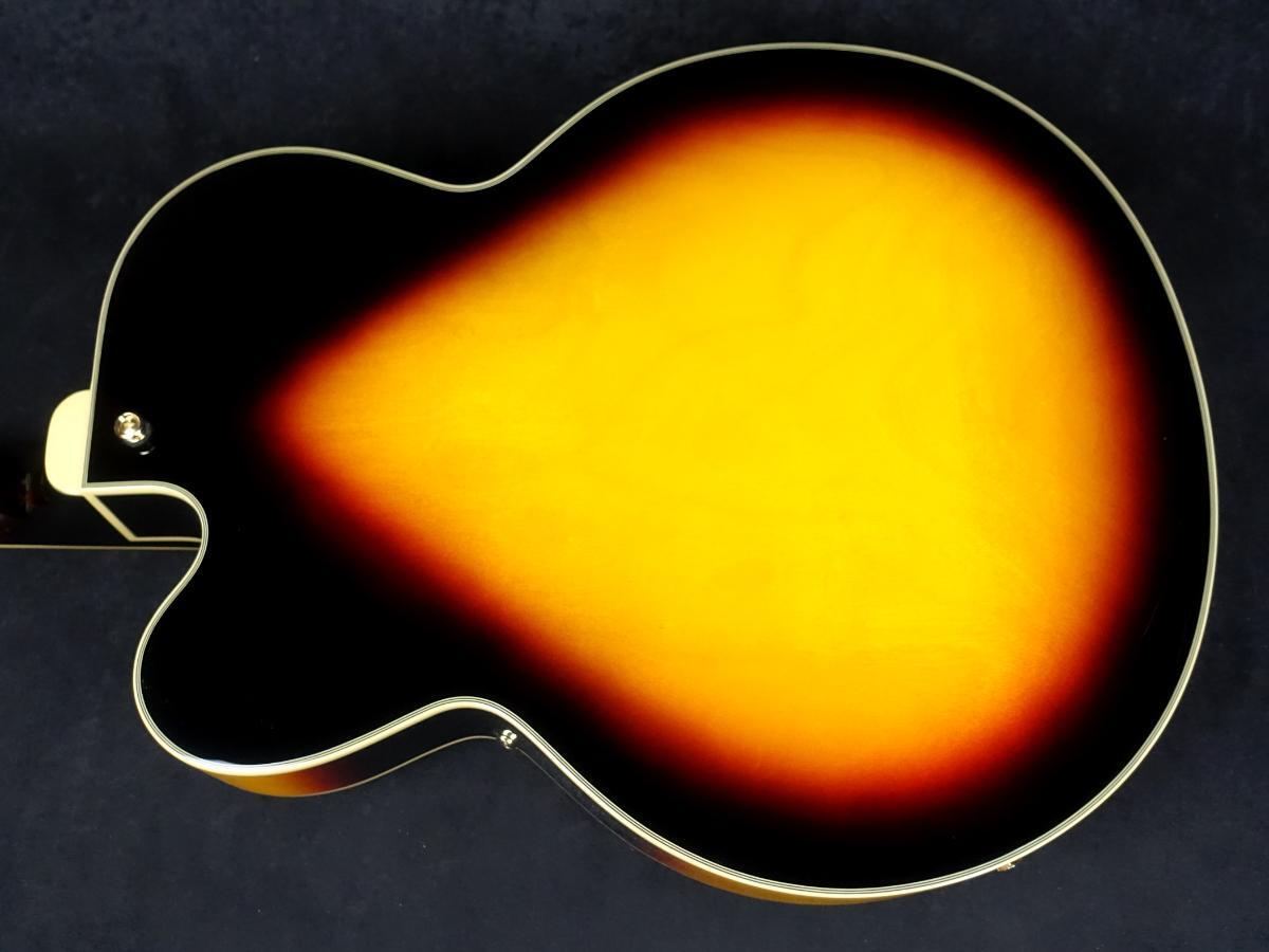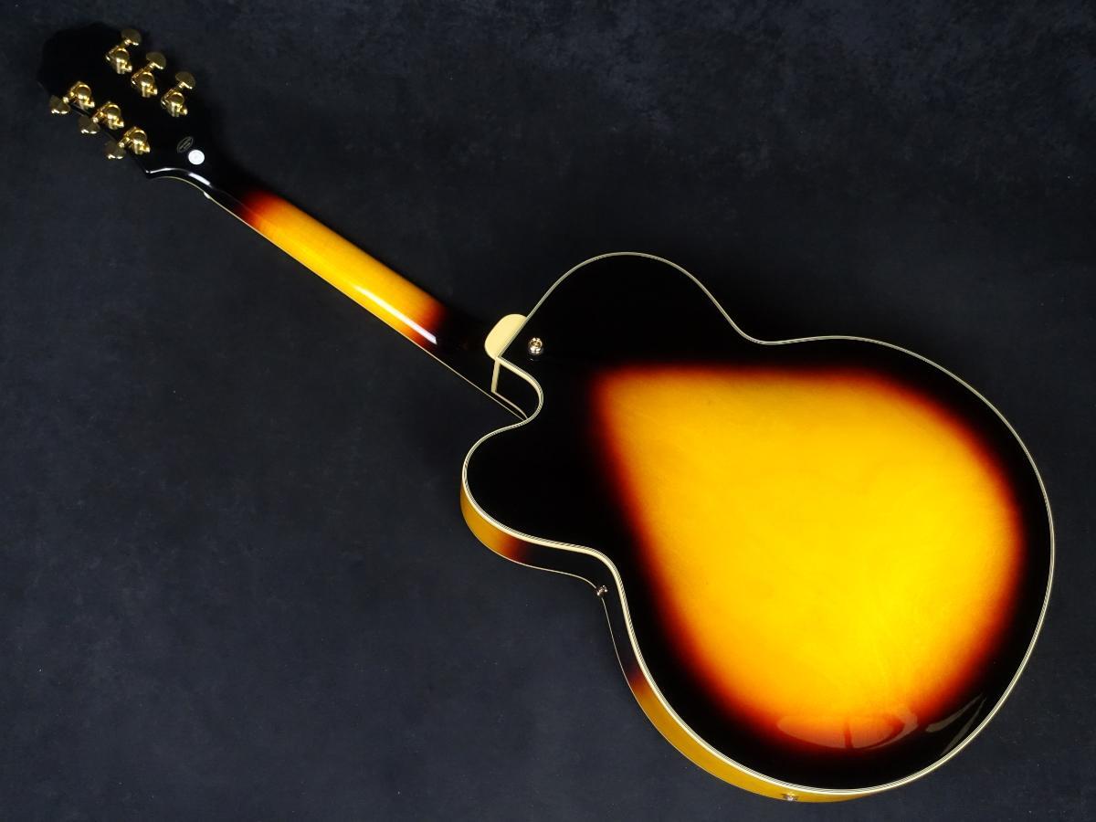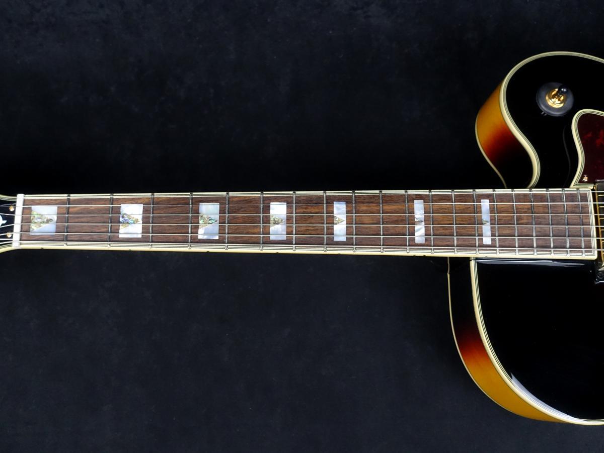 インディアンローレル指板上ではアバロン素材によるトライアングル・インレイとマザーオブパール素材によるブロック・インレイが施され、このジャンルレスに躍動するアーチトップモデルに落ち着いた気品をもたらしています。