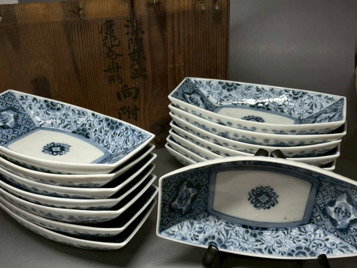 ●深附古代画 唐花巻舟形 向附 15枚 盛皿 角皿 骨董 置物 飾物 日本伝統工芸品 芸術 古美術 時代物 食器 和食器 染付 ■サイズ:横幅 19cm/縦幅 10.3cm/高さ 3.5cm ※素人寸法の為、若干の誤差はご了承ください。 ■状態につきましては経年に伴うスレ・汚れ・小キズ などが見られます。 ※その他の細かな状態は写真にてご確認・ご了承の上 ご入札くださいませ。 ●こちらの商品などは時代物や古いお品・骨董品となり ますので、細かな状態を気にされる方・神経質な方の ご入札はご遠慮くださいませ。【ZC】 |