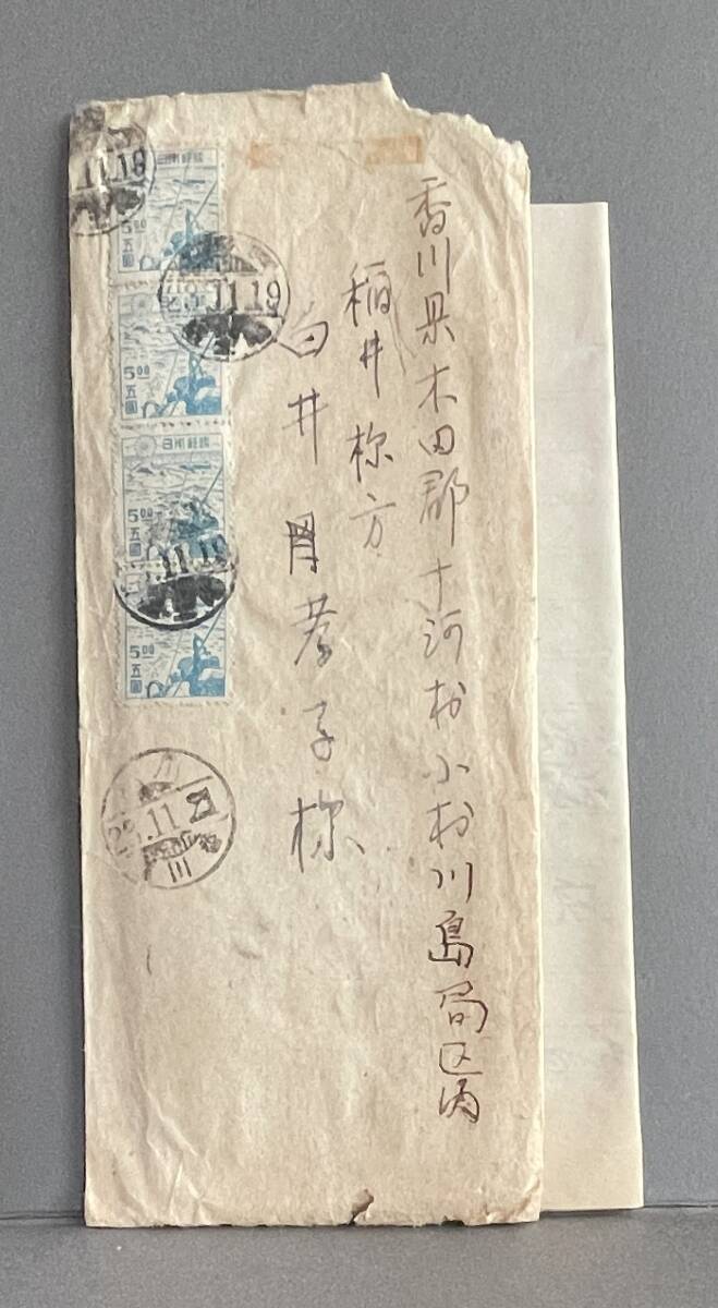 ■エンタイア 速達書状 新2次 捕鯨5円×4枚 多数貼 局名不明23.11.19 埼玉県