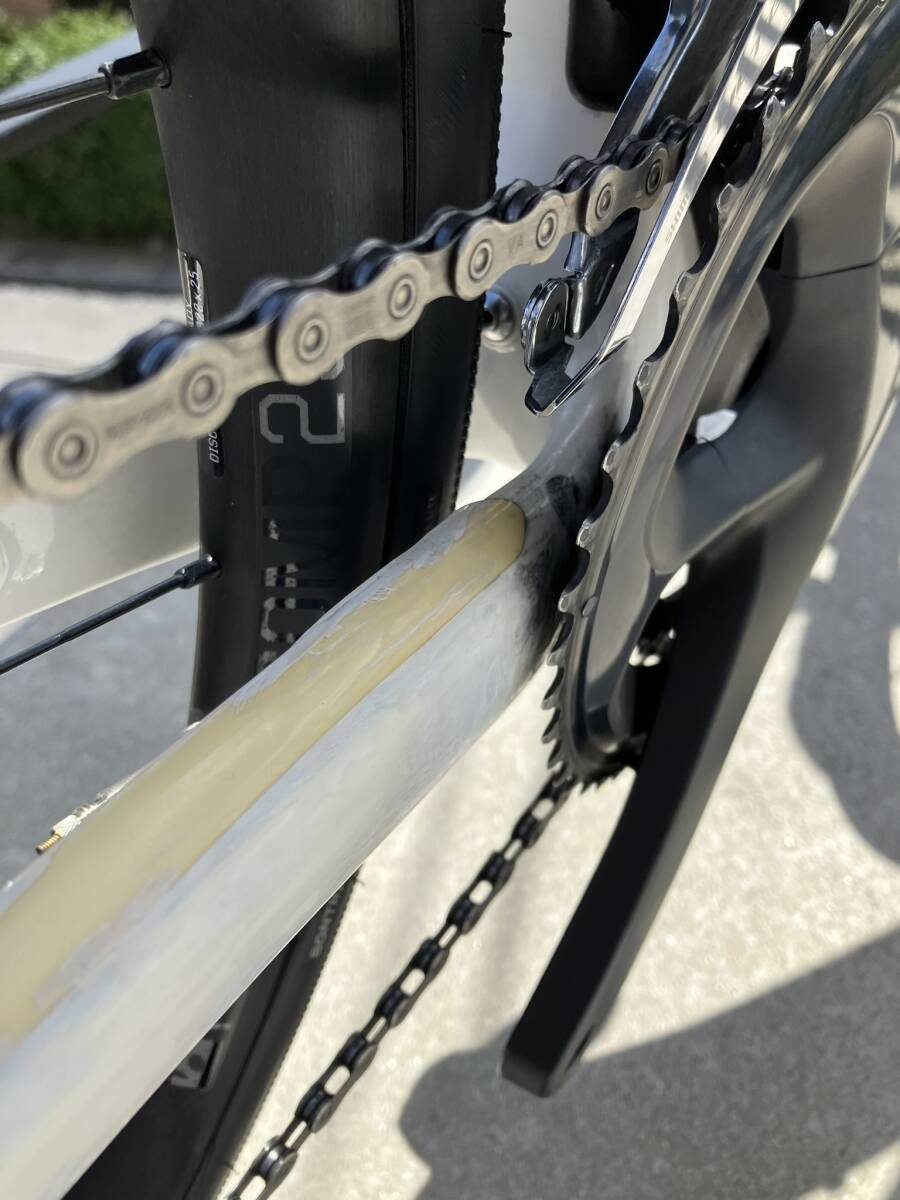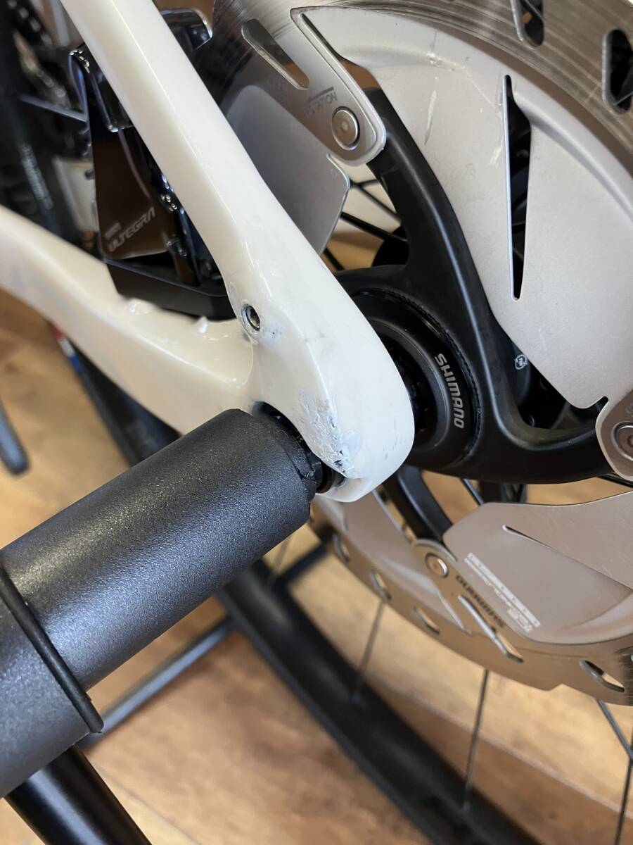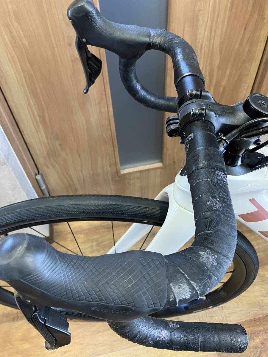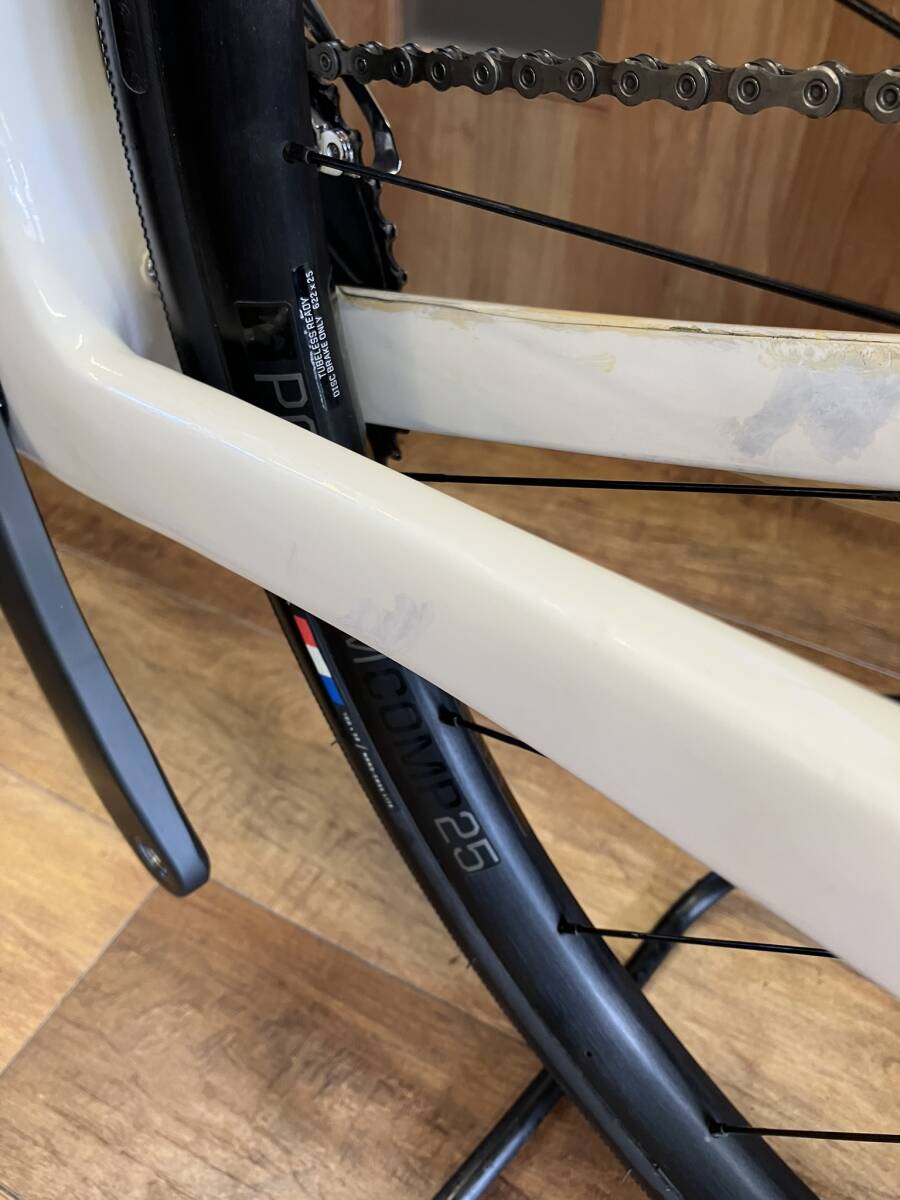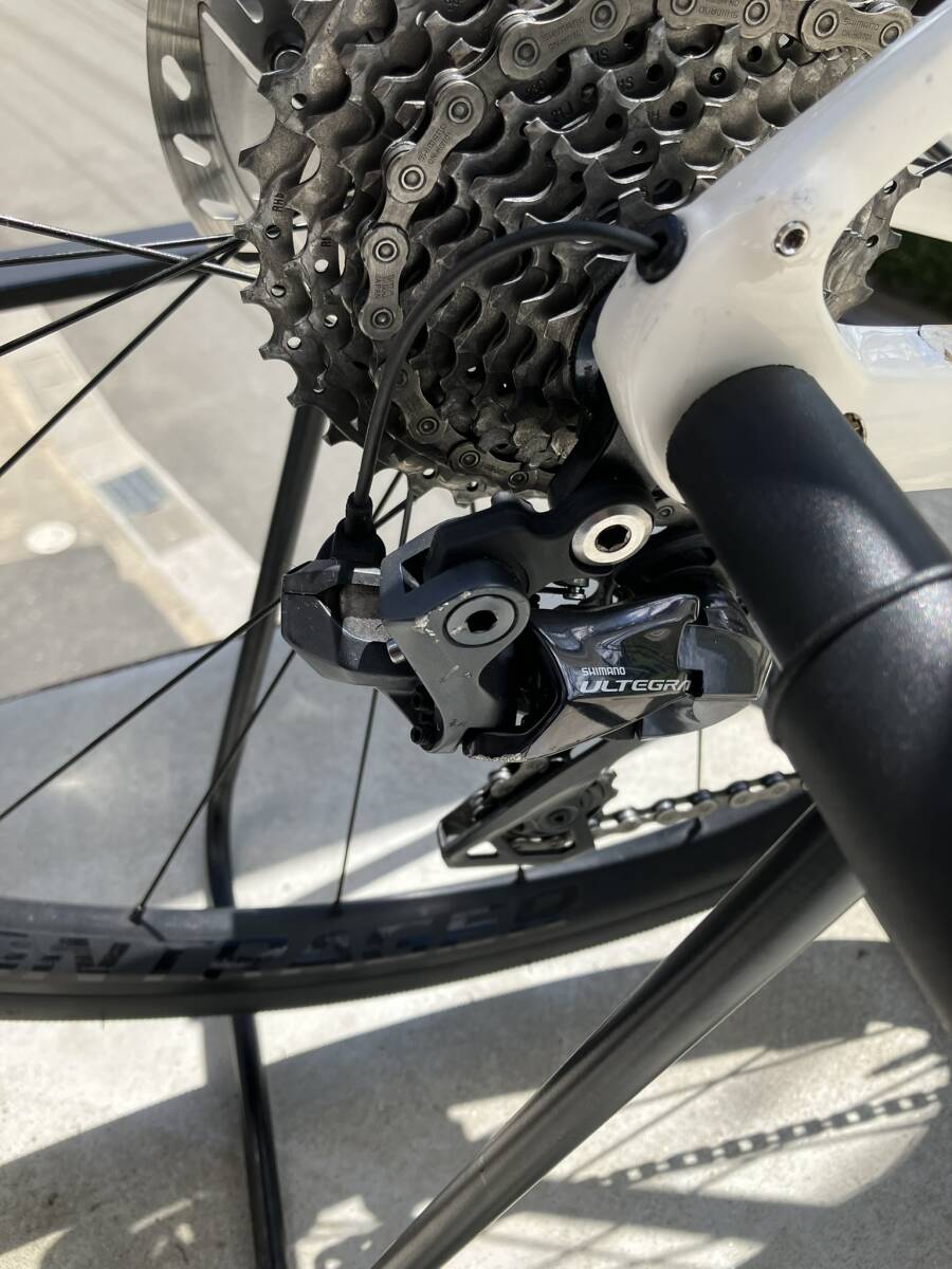 アルテグラのDi2に変更してあります。傷はそれなりにありますが、クラックなどはありません。乗車していてこれと言った問題はありませんでした。写真に写っているスタンドは付いていません。