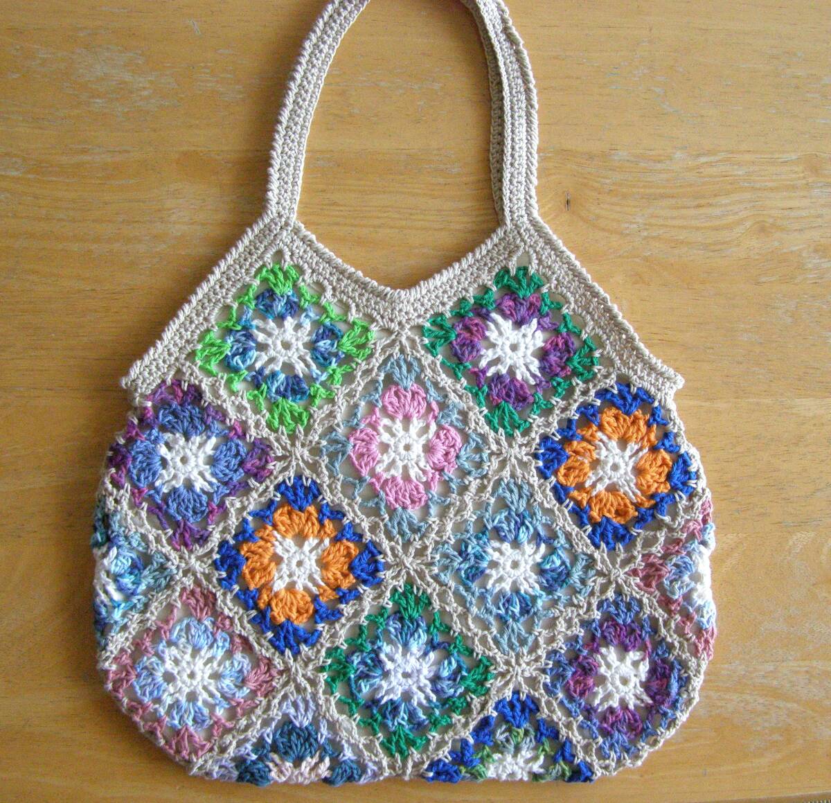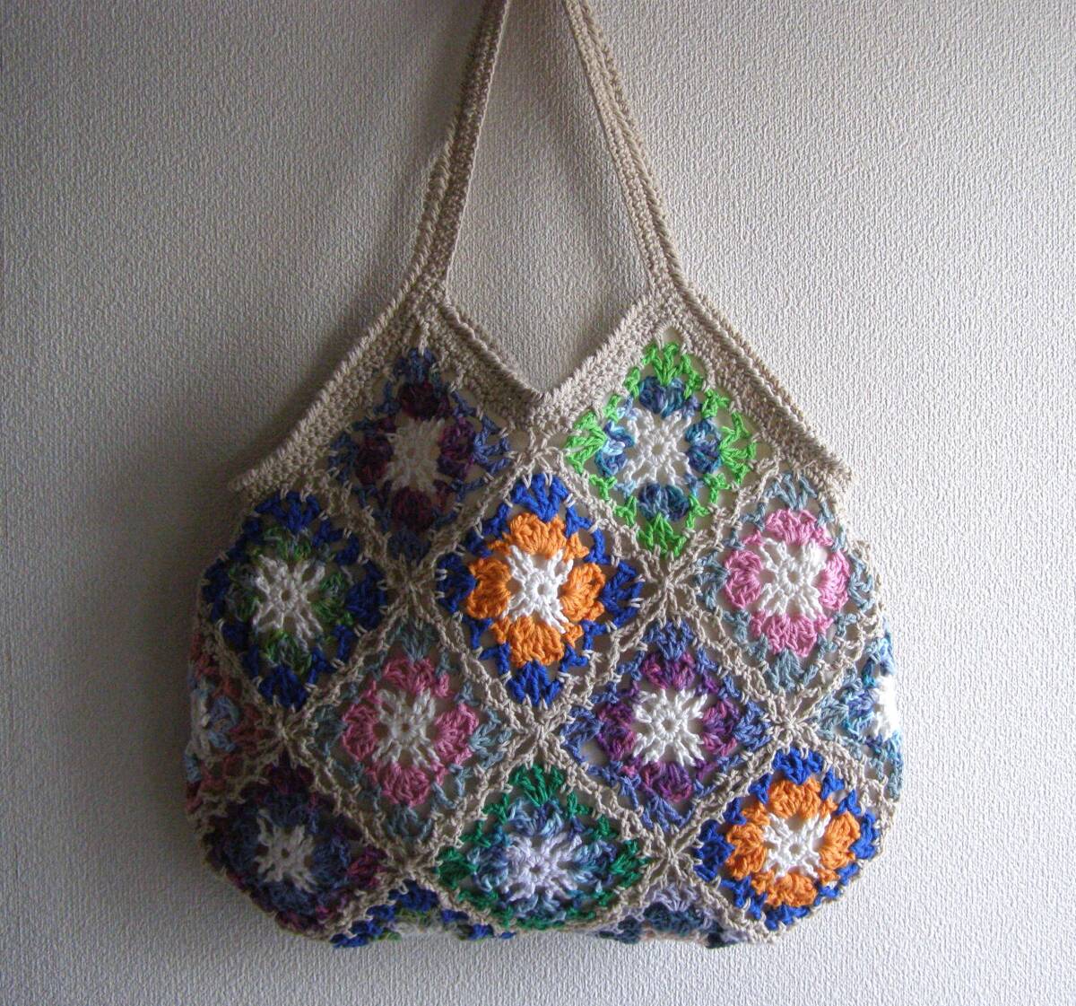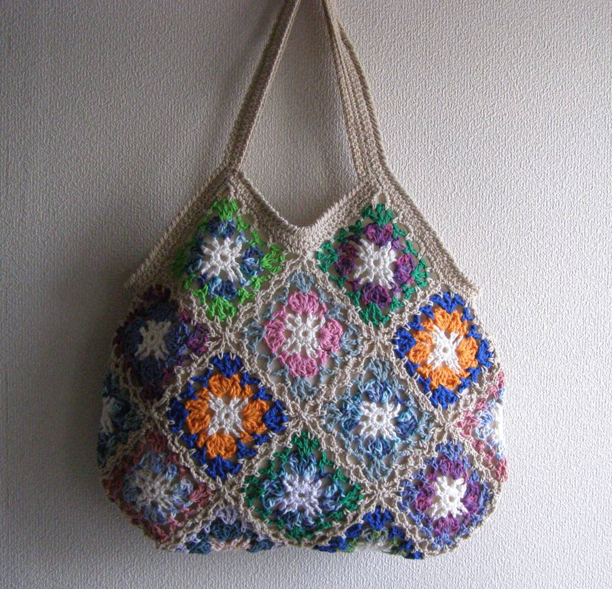 かぎ針でコットン糸のモチーフをつなげて編んだハンドメイドのグラニーバックです。 ★大きさ 横34cm、高さ29cm (高さは持ち手部分を含みません。) 持ち手:長さ38cm 幅 1.8㎝ (素人採寸のため多少の誤差はご了承くださいませ。) ★色 マルチカラー 縁取り:くすみ薄ベージュ 裏地:薄ベージュ コットン糸で編み上げたハンドメイドのグラニーバックです。 編み目がとても美しく、ロマンチックでかわいいですよ♪ マチはありません。裏地にはポケットがついているので、 小物を入れるのに便利です。 サラリとした手触りが心地いいバックです。 ちょっとしたお出かけにいかがですか♪ | ||