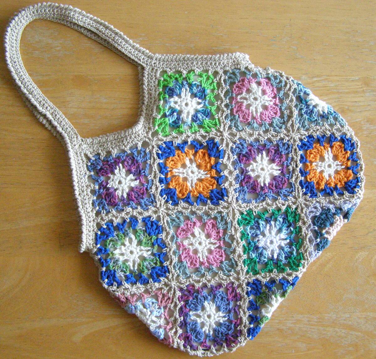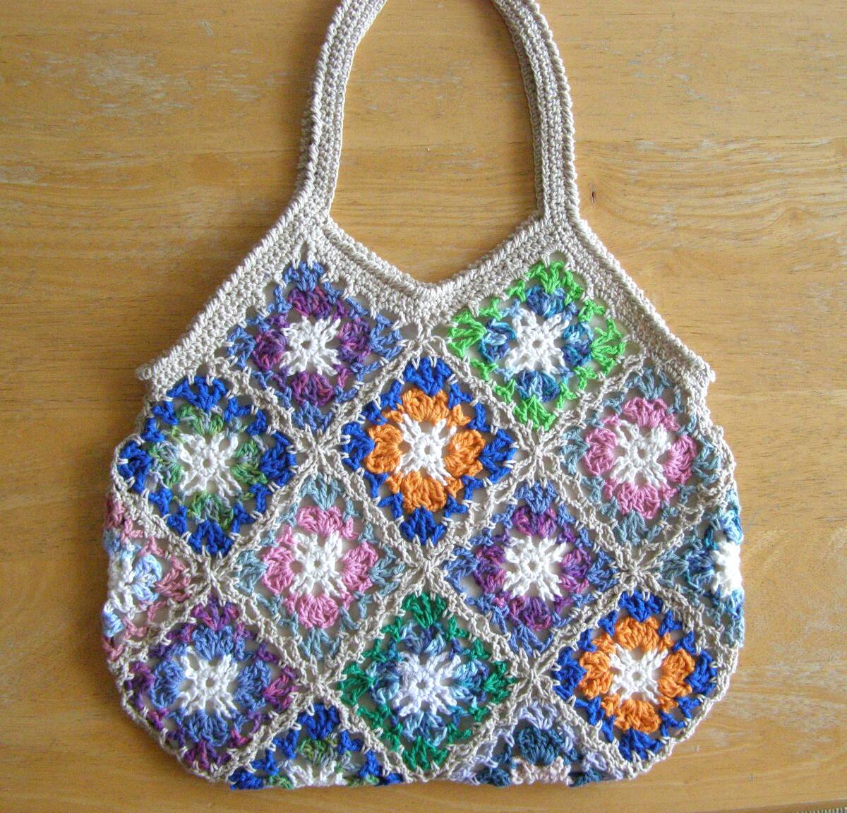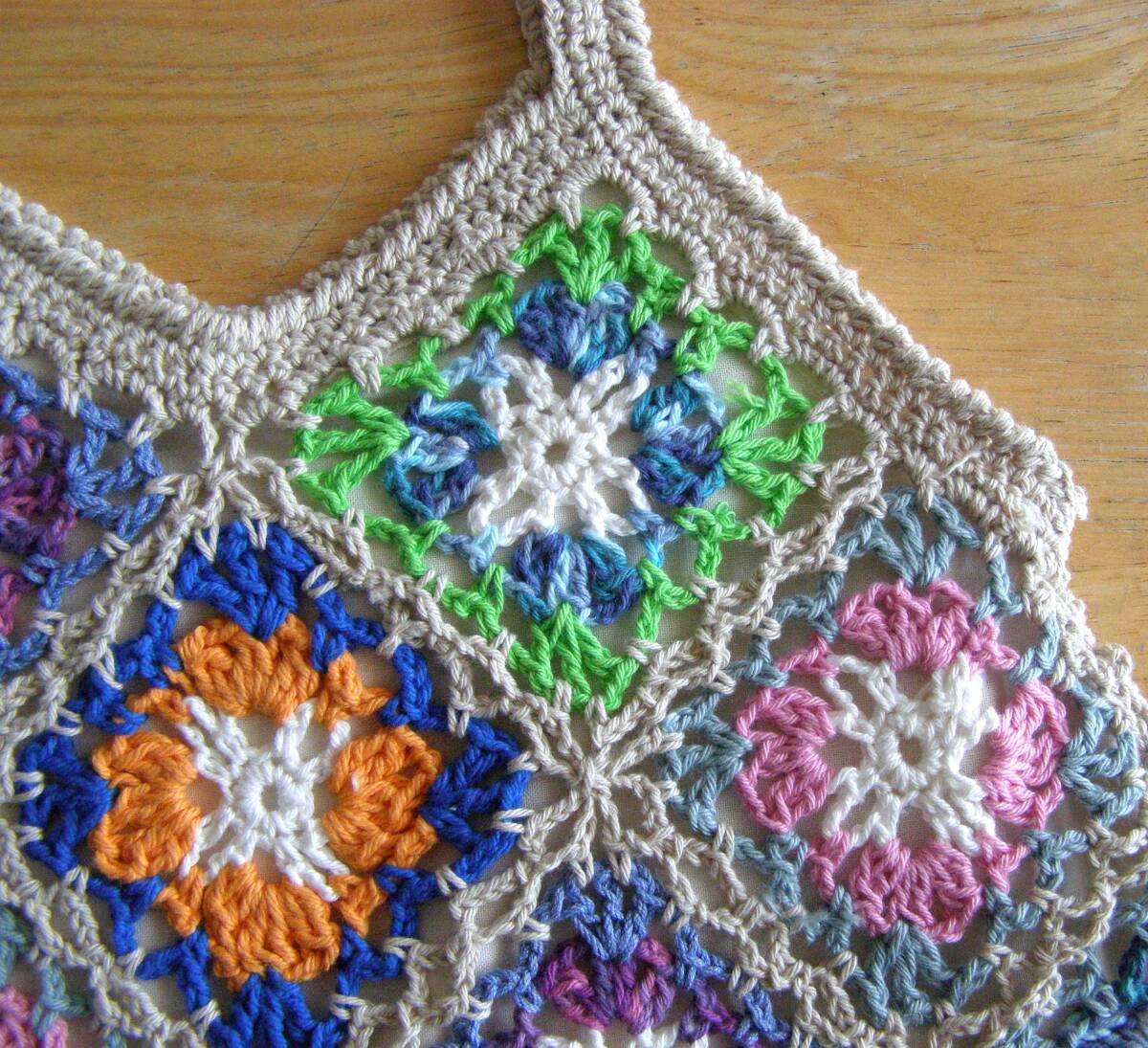 かぎ針でコットン糸のモチーフをつなげて編んだハンドメイドのグラニーバックです。 ★大きさ 横34cm、高さ29cm (高さは持ち手部分を含みません。) 持ち手:長さ38cm 幅 1.8㎝ (素人採寸のため多少の誤差はご了承くださいませ。) ★色 マルチカラー 縁取り:くすみ薄ベージュ 裏地:薄ベージュ コットン糸で編み上げたハンドメイドのグラニーバックです。 編み目がとても美しく、ロマンチックでかわいいですよ♪ マチはありません。裏地にはポケットがついているので、 小物を入れるのに便利です。 サラリとした手触りが心地いいバックです。 ちょっとしたお出かけにいかがですか♪ | ||