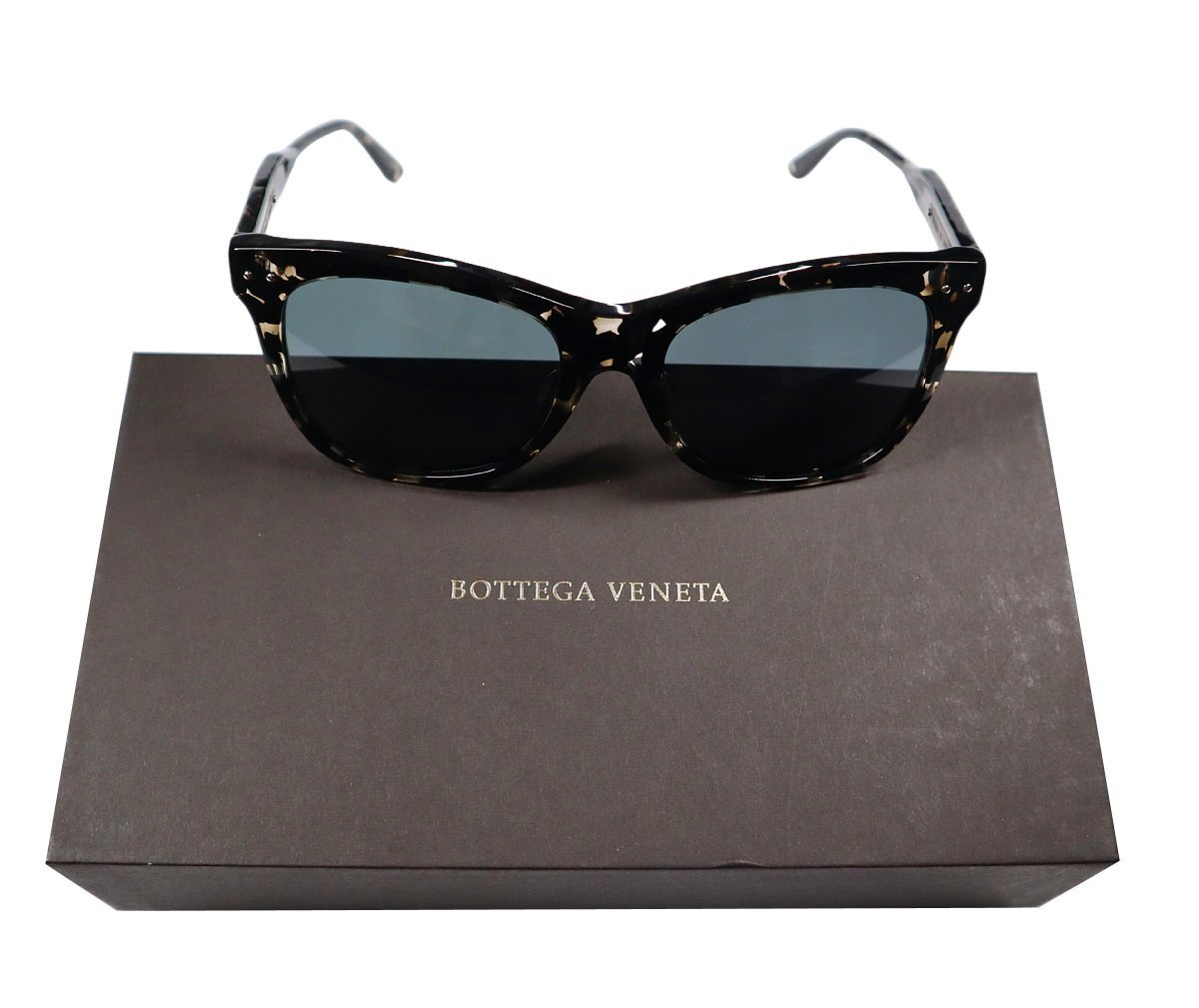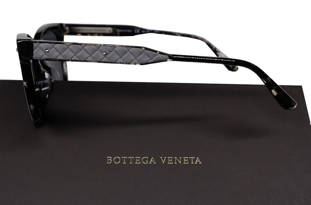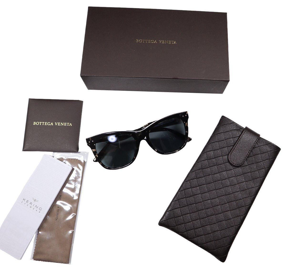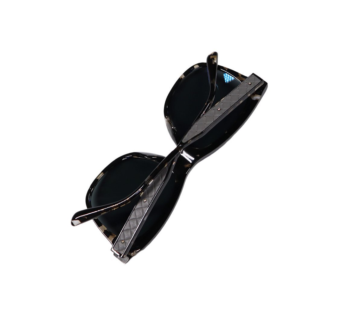 ブラックハバナ 発色が良く、硬質で上質なプラスチックフレームを使用したブラックハバナ色。遠目や日陰ではブラック無地にも見えるブラックの深めの鼈甲柄ですが、日差しの下で見ると鼈甲柄が浮きあがってきます。小ぶりなスタッズがちょっとしたアクセントになっており、テンプル部分には「ボッテガ・ヴェネタ」ならではのグレー色のイントレチャートモチーフのカーフスキンレザーを採用。見るからにラグジュアリーな佇まいになっています。 (※こちらの実物は1~5枚目のものになります)