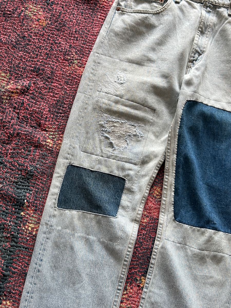 左腿の大きなパッチには、80年代頃のヴィンテージオーバーオールの残布を使用