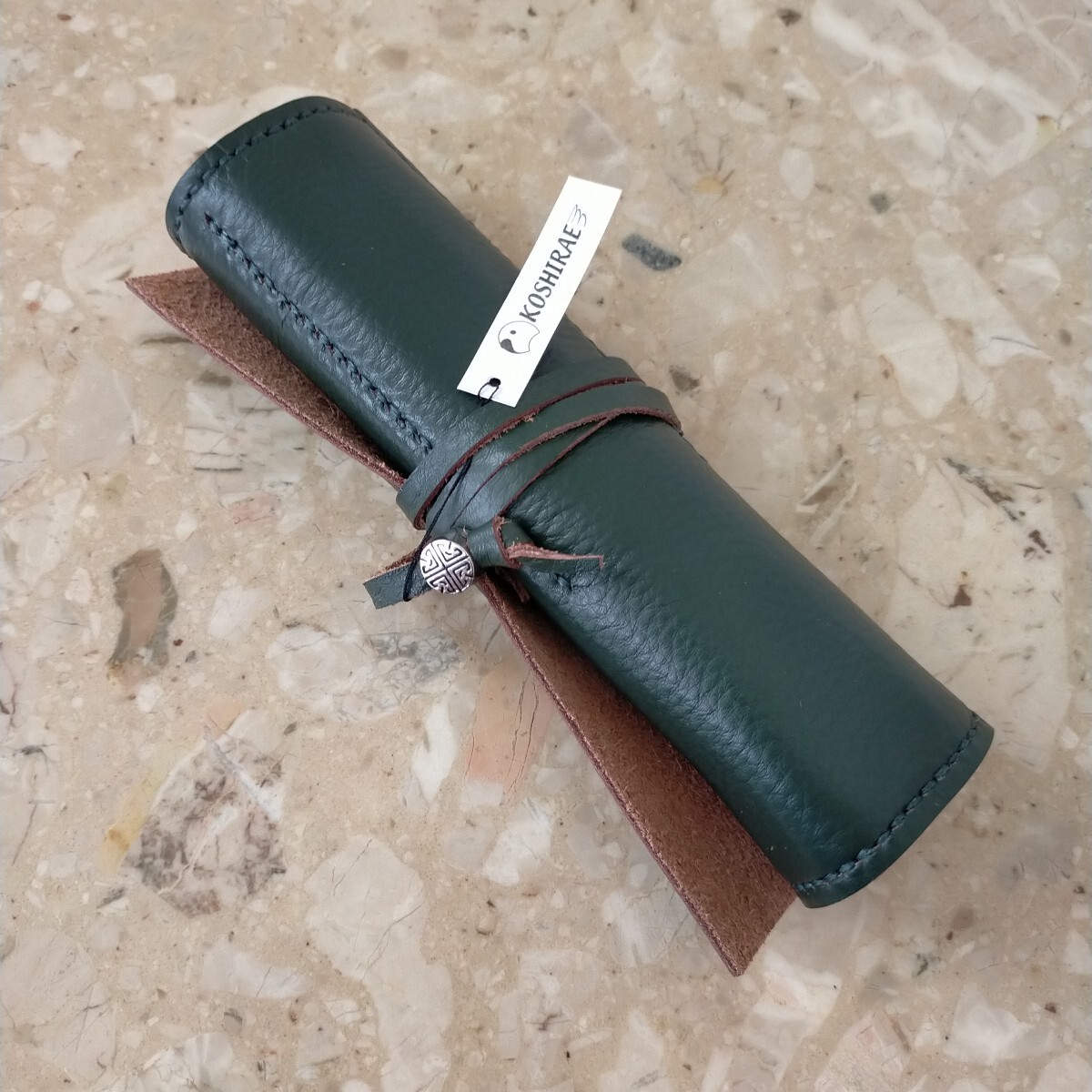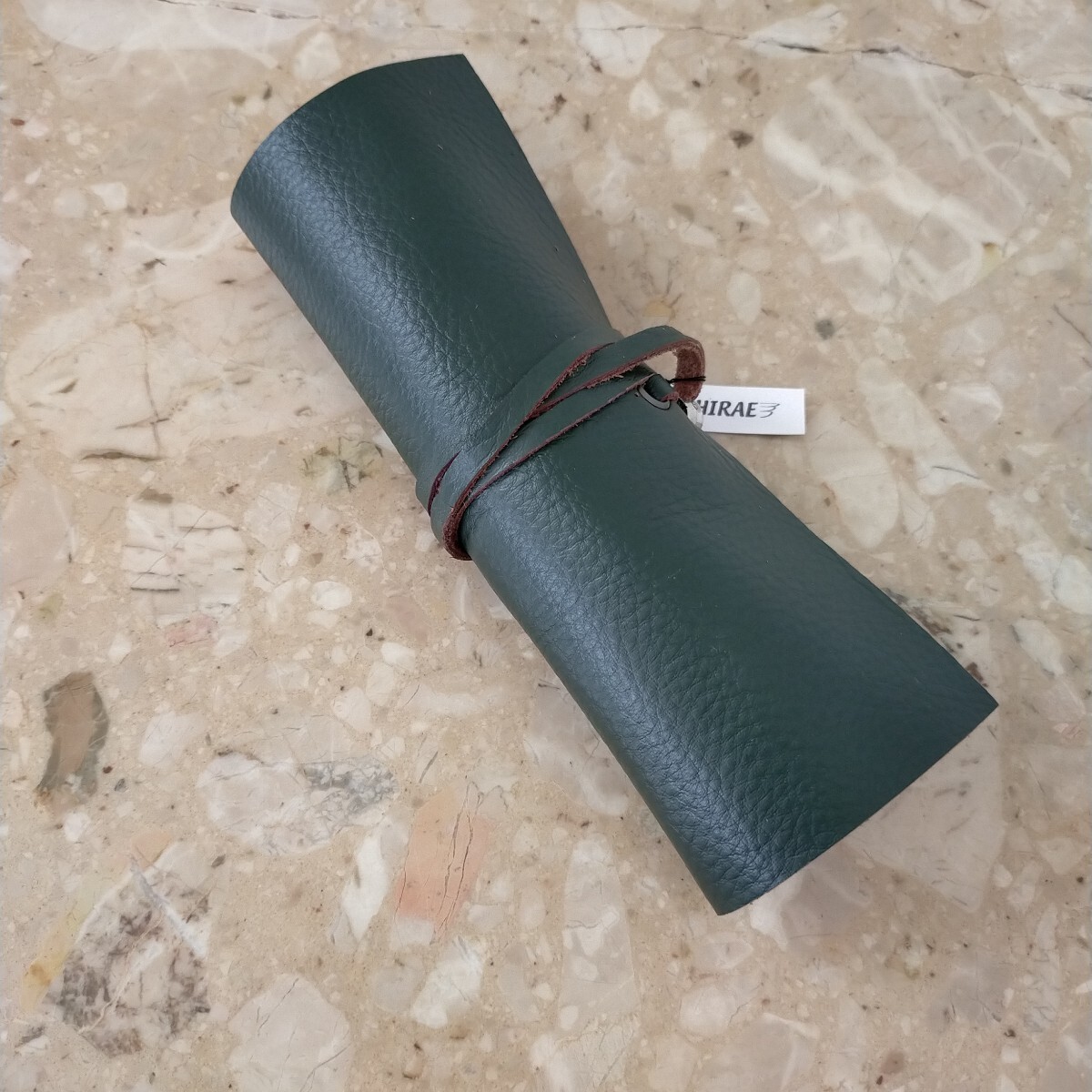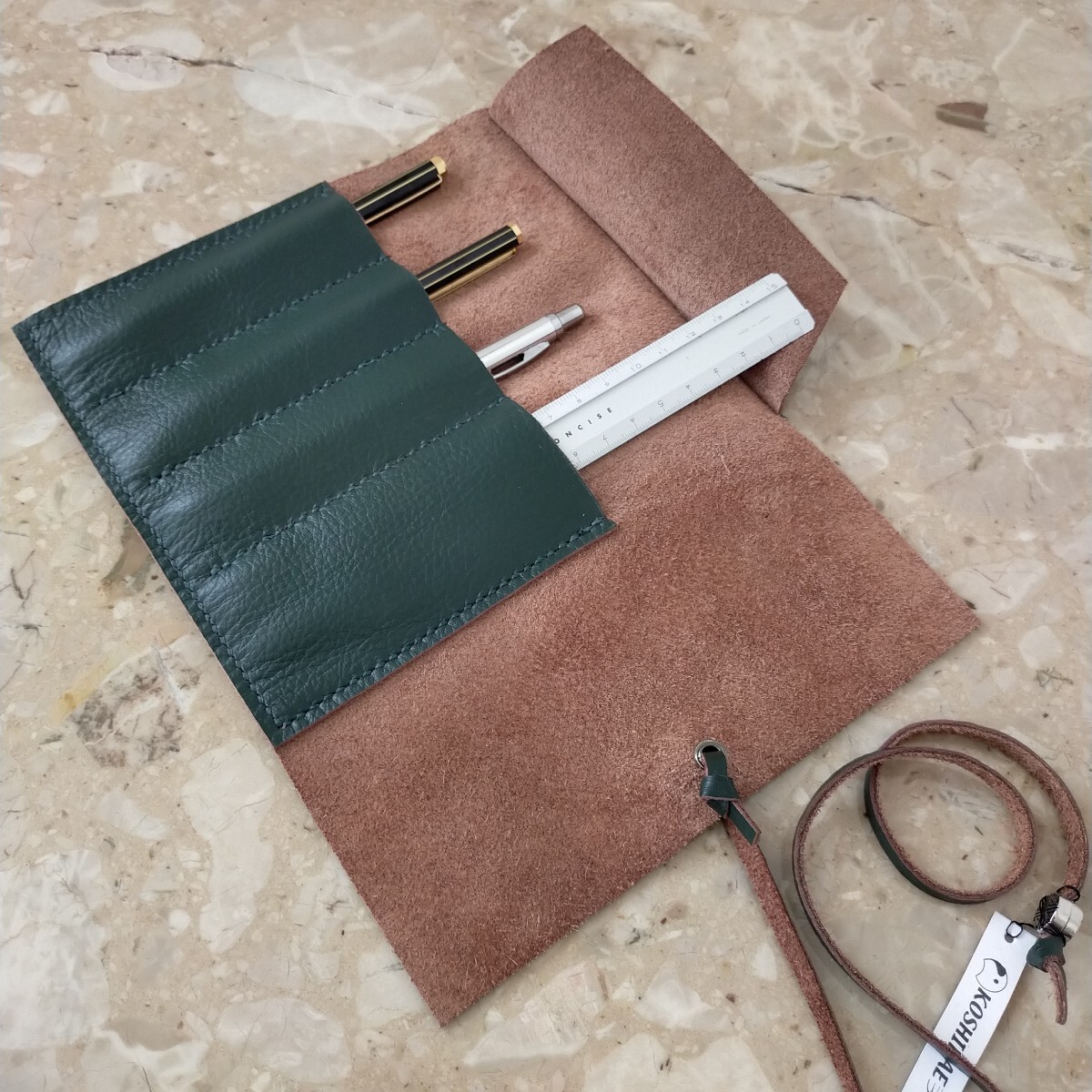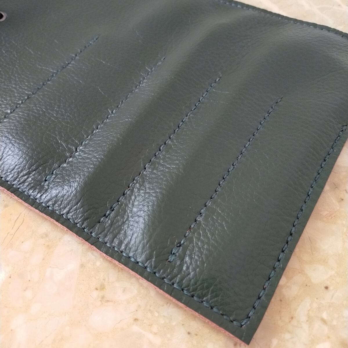 ハンドメイドのロール型ペンケースの出品です。本体は1.5ミリ程で柔らかくしっとりしたモスグリーンの牛革で、家具に使用されていたシュリンクの良質な革です。縫い糸もモスグリーン、紐は同じ革で作り長さ約510㍉で末端にメタルのビーズを取付ました。本体サイズは約240㍉×180㍉、仕切りは4つで1箇所だけ巾を多くしてあり4本以上のペンや、150㍉のスケールも収納出来ます。本体はミシン縫いとは違い手縫いですので簡単にはほつれません。細心の注意を払い作成しましたがハンドメイドの為、多少の傷や汚れがあリ、又革には個体によるシワや血管等の模様が有る場合がございます。店屋さんで販売している様な完璧な商品とは違いますが、革の厚みも有り、とても格好良いのできっと満足していただけると思います。出品にはペンは含まれません。以上をご理解の上のご購入をお待ちしております。