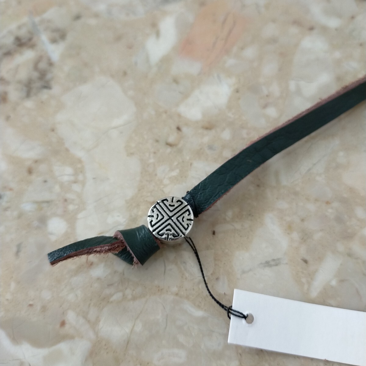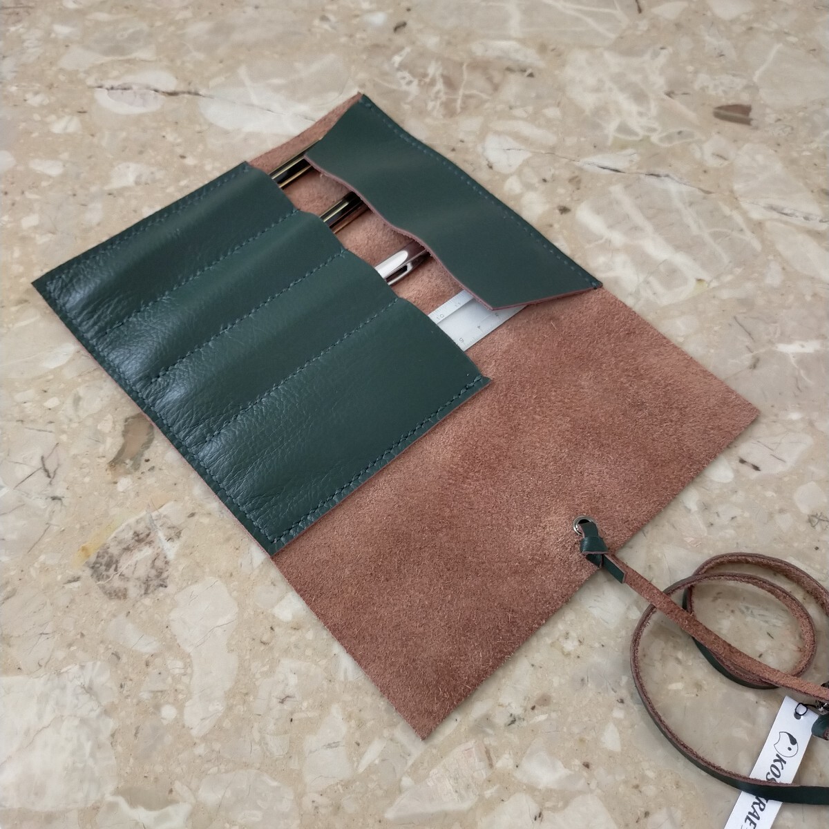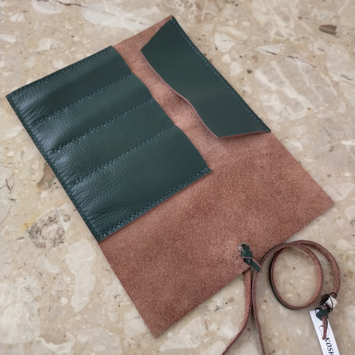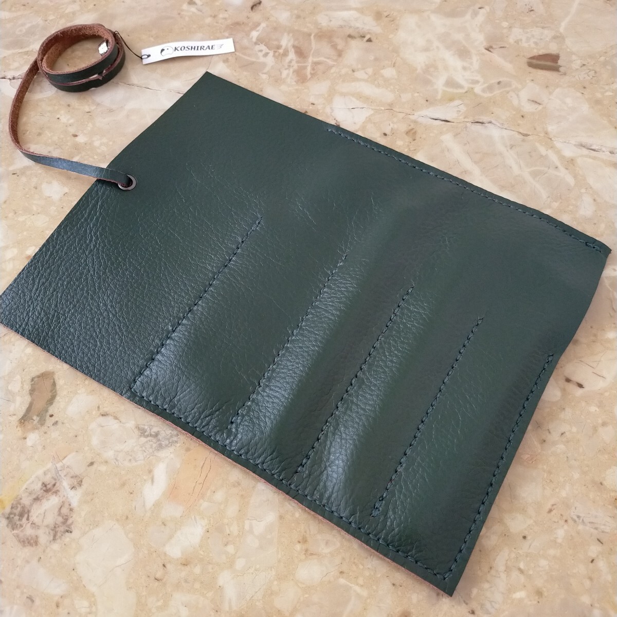 ハンドメイドのロール型ペンケースの出品です。本体は1.5ミリ程で柔らかくしっとりしたモスグリーンの牛革で、家具に使用されていたシュリンクの良質な革です。縫い糸もモスグリーン、紐は同じ革で作り長さ約510㍉で末端にメタルのビーズを取付ました。本体サイズは約240㍉×180㍉、仕切りは4つで1箇所だけ巾を多くしてあり4本以上のペンや、150㍉のスケールも収納出来ます。本体はミシン縫いとは違い手縫いですので簡単にはほつれません。細心の注意を払い作成しましたがハンドメイドの為、多少の傷や汚れがあリ、又革には個体によるシワや血管等の模様が有る場合がございます。店屋さんで販売している様な完璧な商品とは違いますが、革の厚みも有り、とても格好良いのできっと満足していただけると思います。出品にはペンは含まれません。以上をご理解の上のご購入をお待ちしております。
