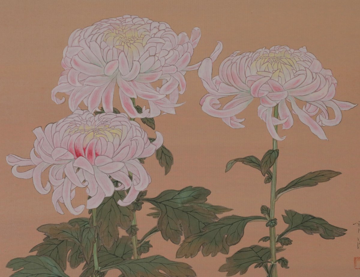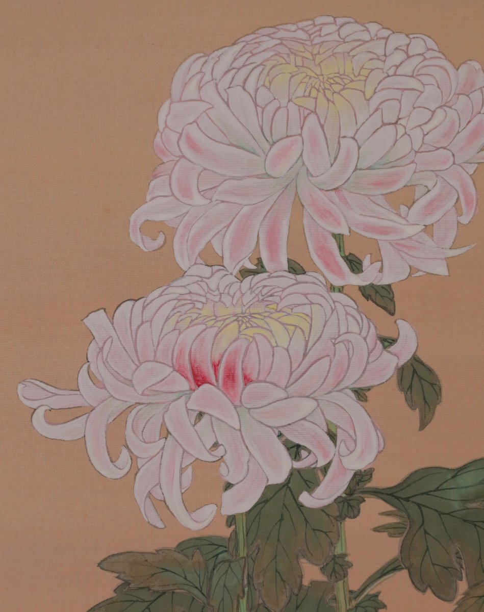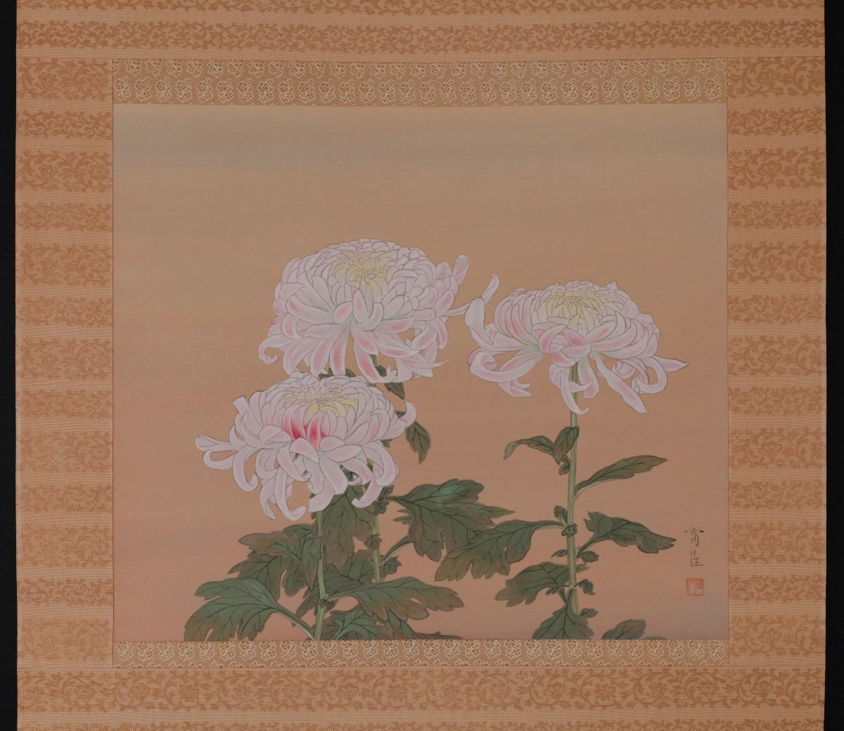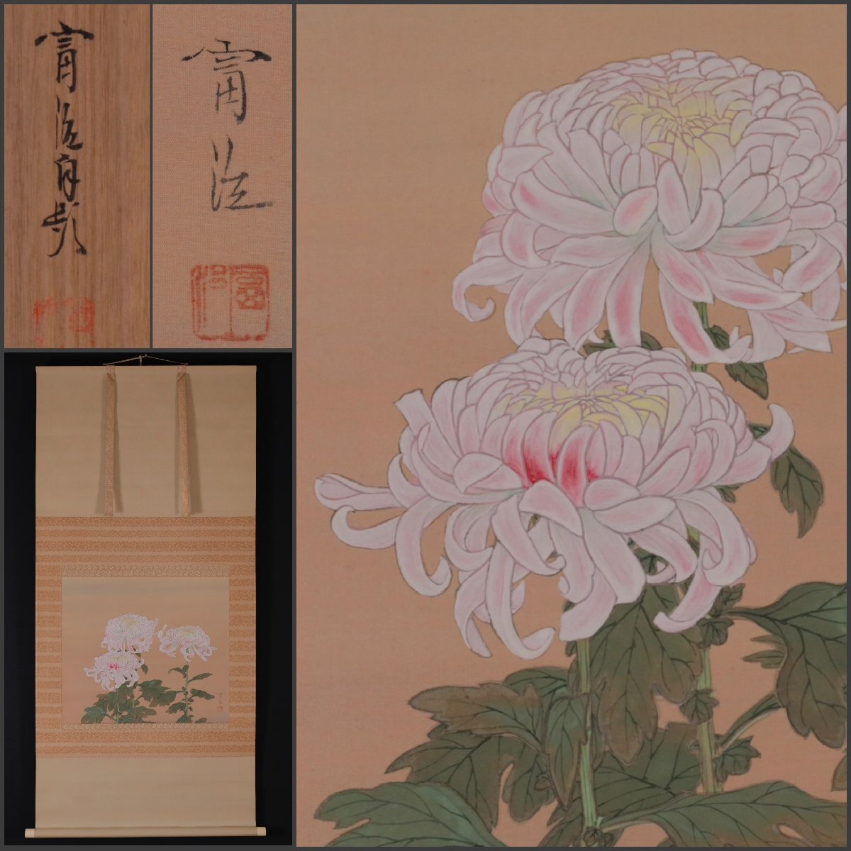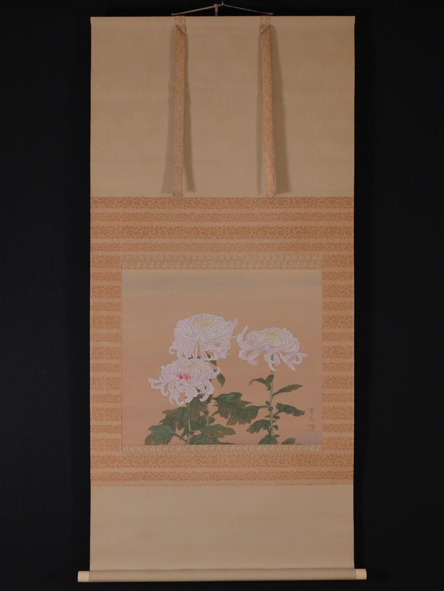 【模写】吉】12637 根上富治 菊図 太巻 共箱 二重箱 結城素明・岡田三郎助師事 山形県の人 茶掛け 茶道具 中国画 掛軸 掛け軸 骨董品