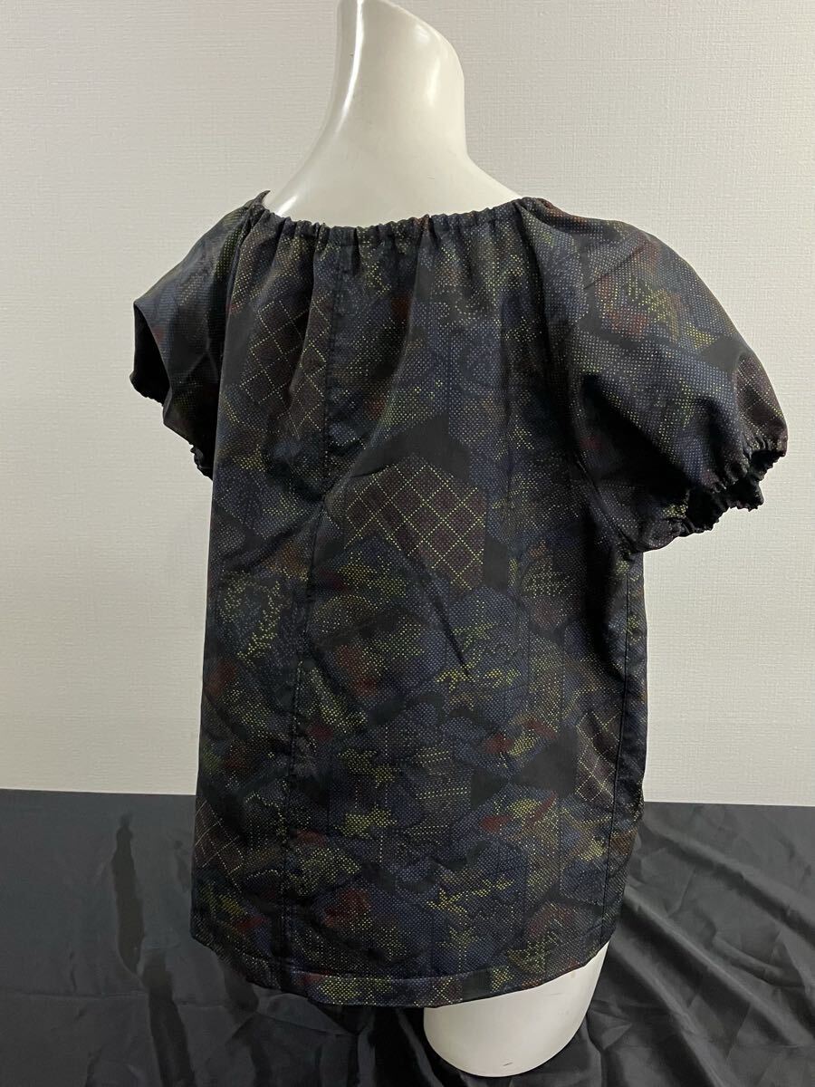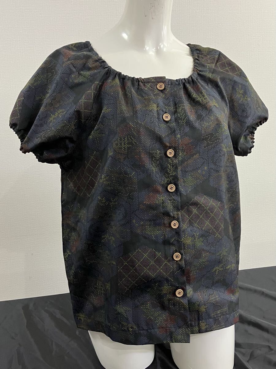 お色はすみ黒、茶、青、緑、オレンジ、黄色などの柄で、全体的には落ち着いたトーンです。ラグランデザインで前にボタンが7個付いたスクエア衿です。衿や袖口にゴムを入れて着やすさもOK!ベスト代わりにタートルネックと合わせて着ても可愛い♪年中活躍できそうデザインでオススメです。透け感なし伸縮性なし