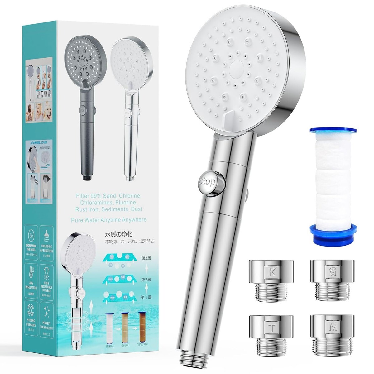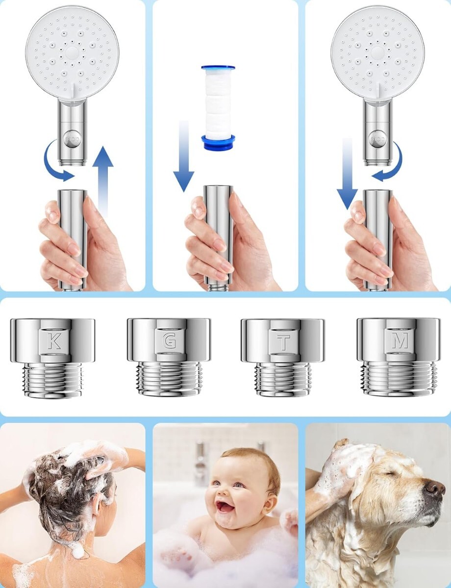 【取付簡単 & 国際汎用規格】M・K・G・Oの4種類アダプター付きで、ほとんどの家庭用シャワーに対応。国際標準G1/2インターフェース設計により、工具不要でわずか3秒で取付完了。届いたその日からすぐに快適なシャワー体験が始まります。