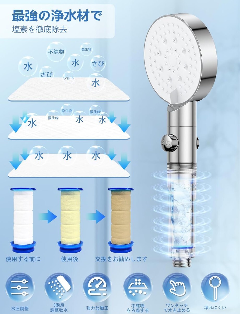 【塩素除去で髪も肌もやさしくケア】綿製の浄水カートリッジを内蔵し、さらに国際標準の高品質浄水素材を充填。水道水に残る塩素や微細な不純物・堆積物を徹底的に除去します。敏感肌やお子様の肌にもやさしく、髪のキシみや乾燥を防ぐ安心設計です。
