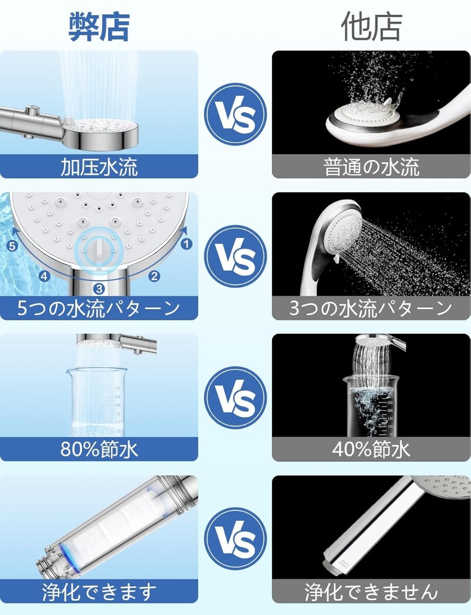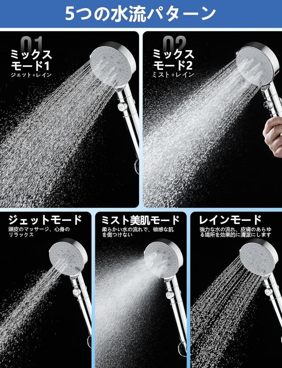 シャワーヘッド マイクロナノバブル 節水 高洗浄力 塩素除去 5段階水流 手元止水 美髪 保湿保温 毛穴汚れ除去 お風呂 浴室用 バス用品 軽量 うるおい 国際汎用基準ジョイント 4種類アダプター付き 浄水カートリッジ1本付き 取り付け簡単