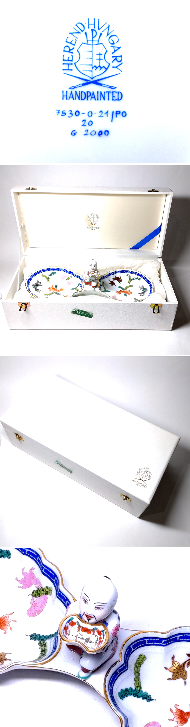 状態 【HEREND/ヘレンド】 シノワズリ 魚藻紋様 素敵なツインディッシュです。   シリーズは、19世紀中頃中国に古くから伝わる「魚藻文様」を参考に制作された【Poissons/ポワッソン】です。   1850年代に発表され今ではヘレンドのシノワズリシリーズのエントリーモデルとなっております。   中央に鎮座する華やかな衣装の唐人のフィギュリン、存在感のある鮮やかな鯉や金魚におとらない堂々たる青色の幾何学的の縁どりが目を引きます。   細部まで繊細に表現された秀逸な作でございます。   オリジナルBOX付き。
