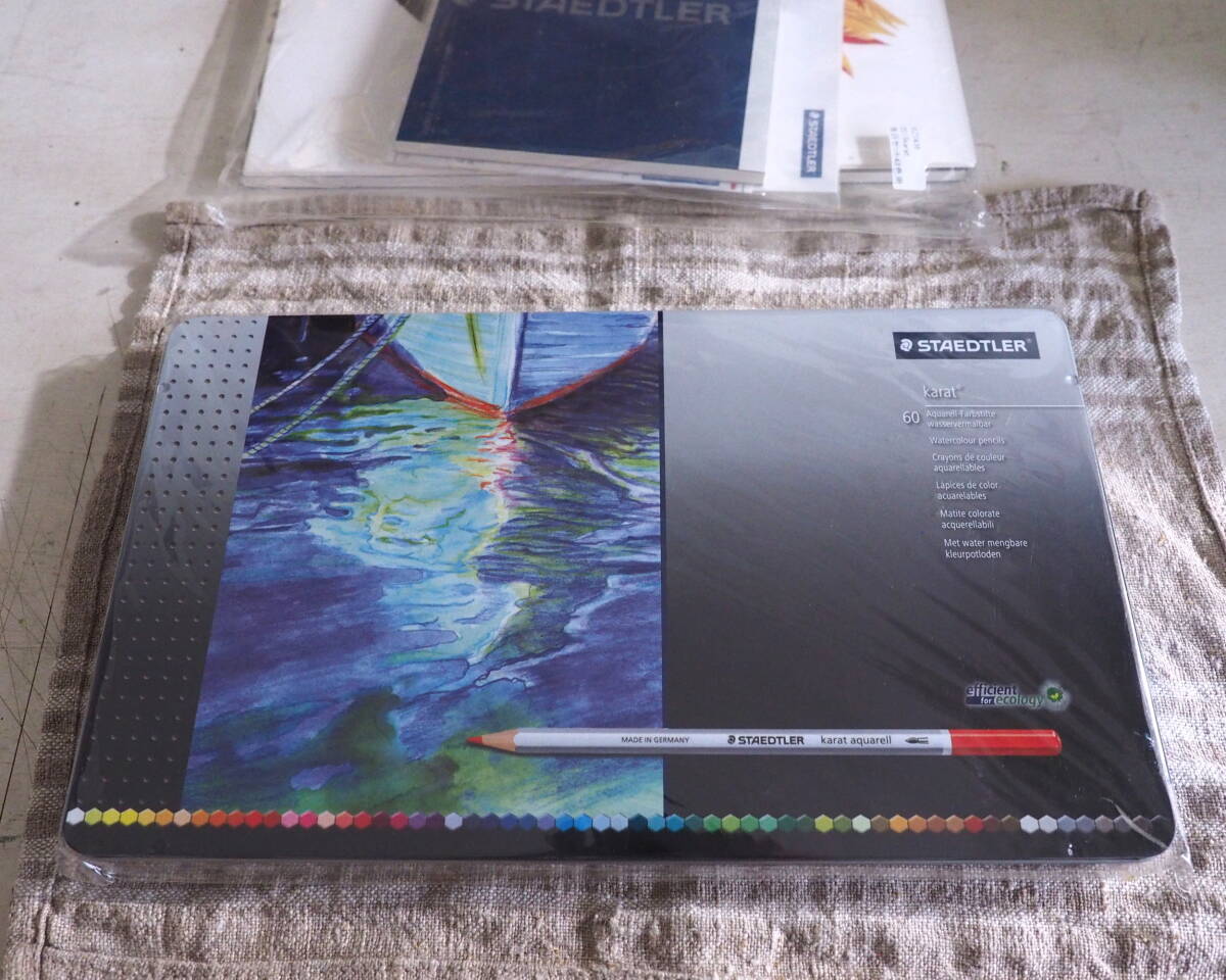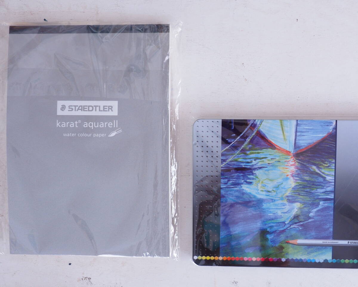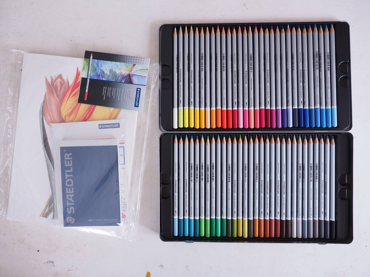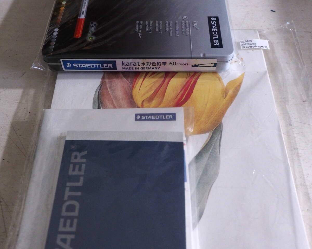 付属の品は、こちらのセットではないかも知れませんが、ステッドラー水彩色鉛筆に付属していたテキストや用紙などです。