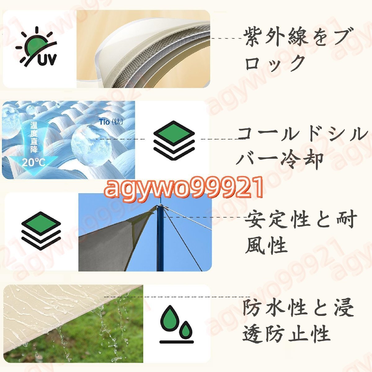 安定性と防風性:この防水キャンプタープカーオーニングは新しくアップグレードされた210Dコールドシルバー生地で作られており、軽量で耐摩耗性があり、保管が簡単で、引き裂き抵抗≧750N、優れた耐風性と優れた安定性を備えています。