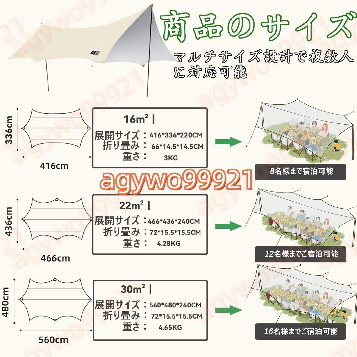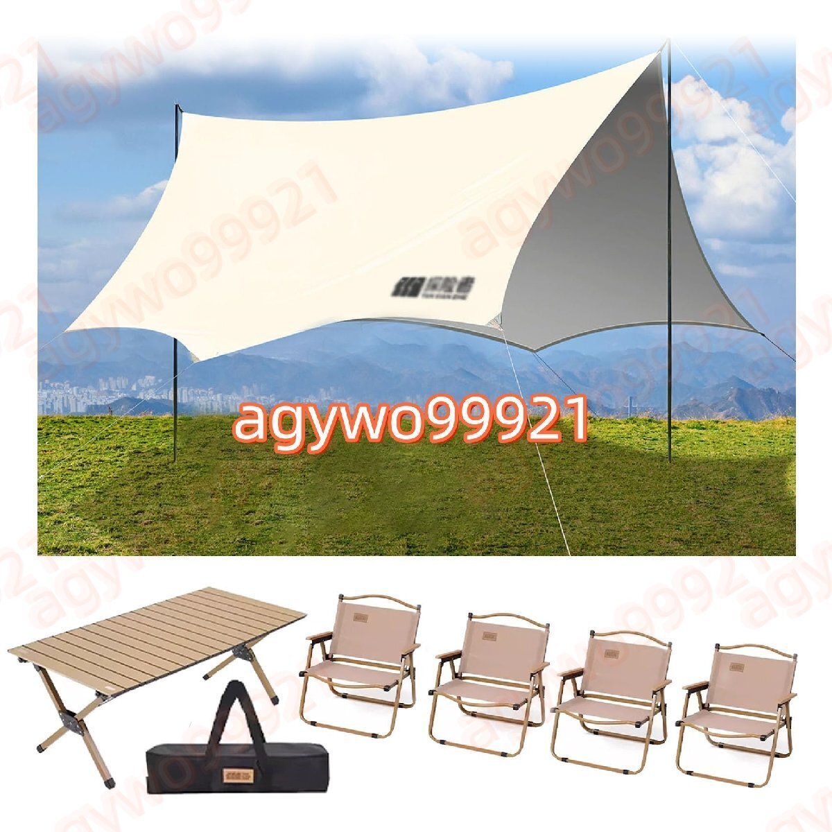 パッキングリスト:16㎡/22㎡/30㎡のキャンプ用ターポリン*1、折りたたみテーブル*1(120*60*46cm、収納袋付き)、折りたたみ椅子*4(52*46*52cm)。このセットは2つのパッケージで発送され、2つのパッケージが届きますので、同時に到着しない場合はお待ちください。