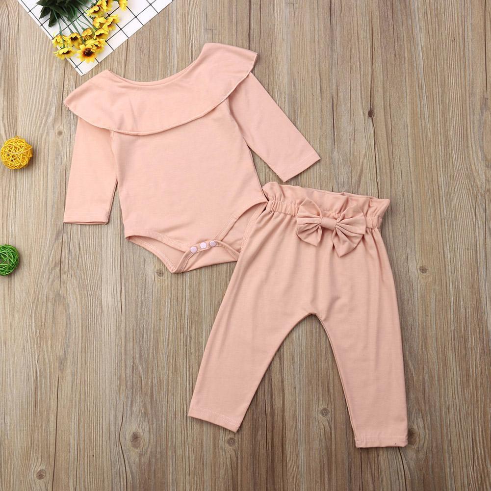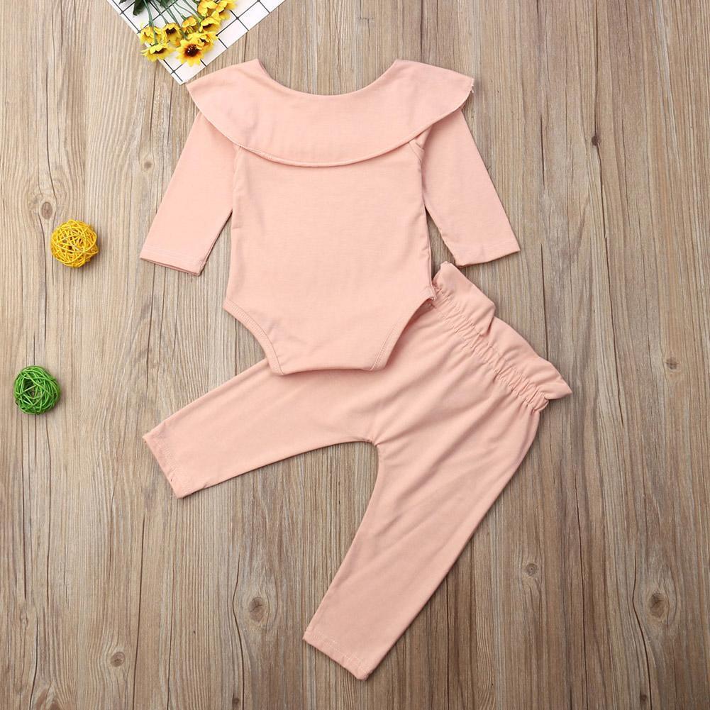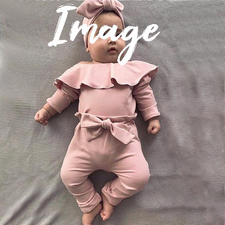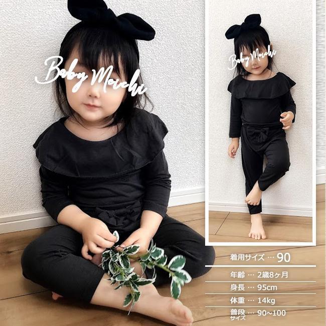 襟元のフリルがカワイイ!長袖ロンパースとリボン付きパンツの2点セット。海外製にしては縫製もキレイめで、生地の質感も良く、スルスルとした手触りで気持ち良いです。パンツのゴムはよく伸びるので着せやすい♪普段着にはもちろんパジャマやお散歩着にも♪
