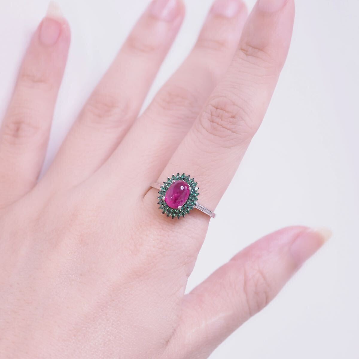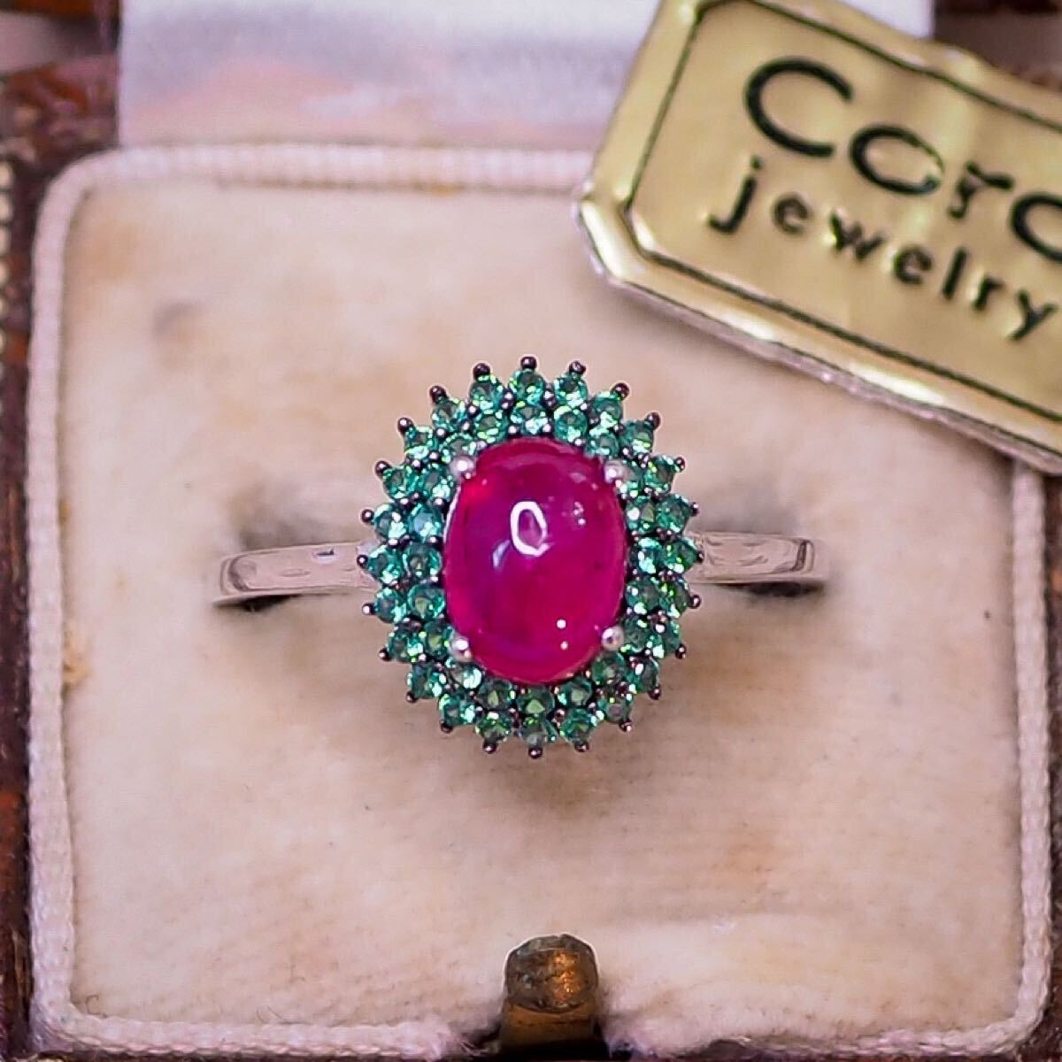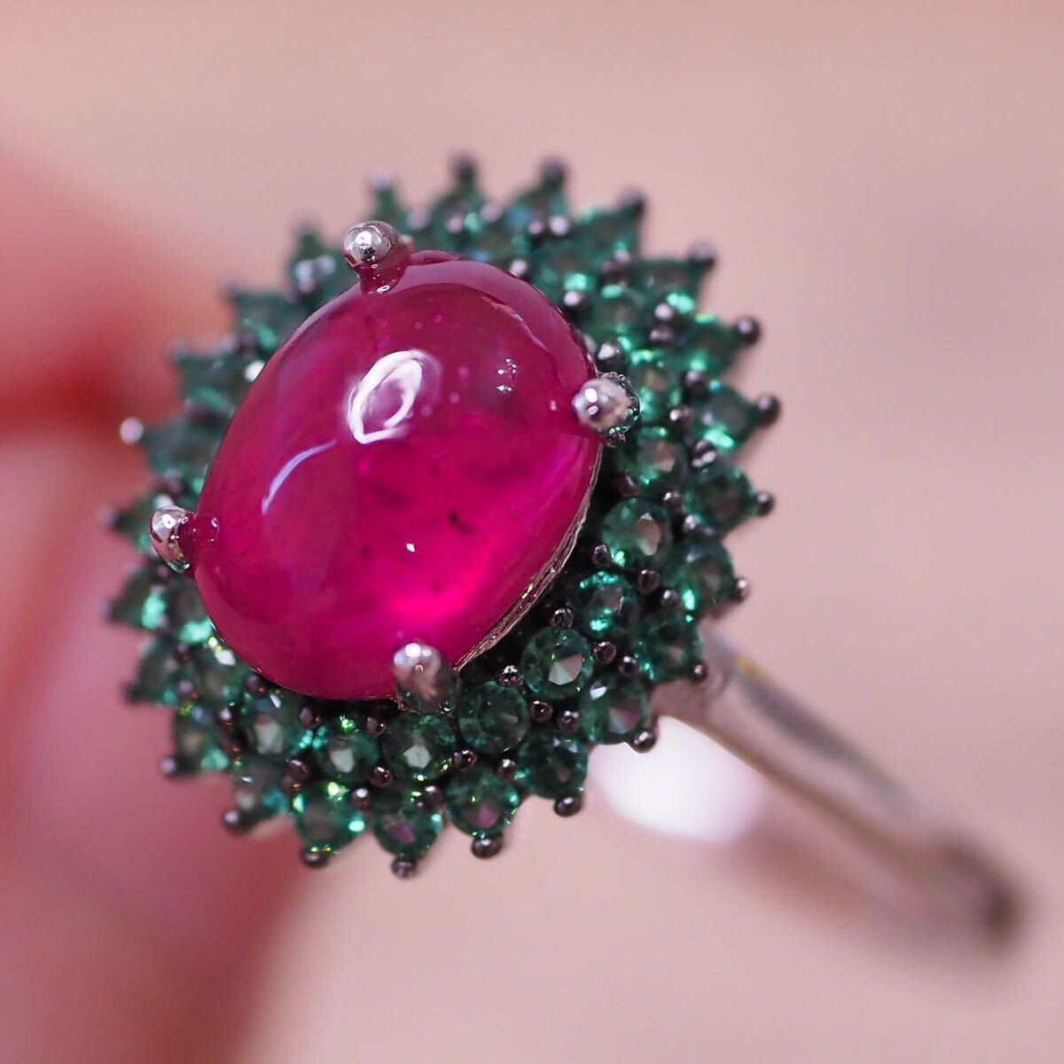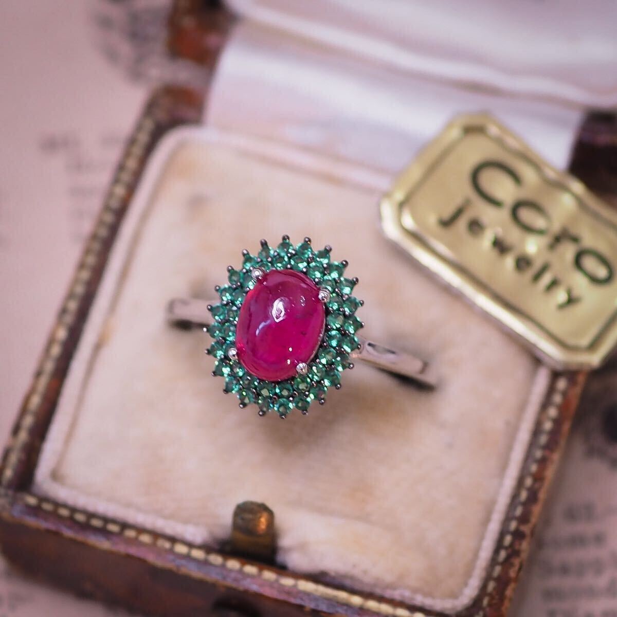 ウォーターメロンカラーのお仕立てのルビーリング。ぷるんとしたカボションカットの中には浮遊するインクルージョンが確認できます。周りをラウンドするフォレストグリーンのジュエル、カットの仕方でしょうか、キラッキラッとお指を動かすたびに煌びやかな輝きを見せてくれます。お見た目はエメラルドですが、輝き方はダイヤモンドのような反射をします。