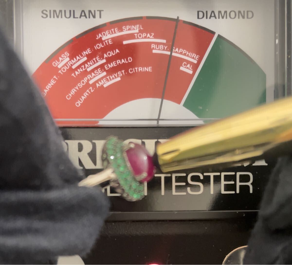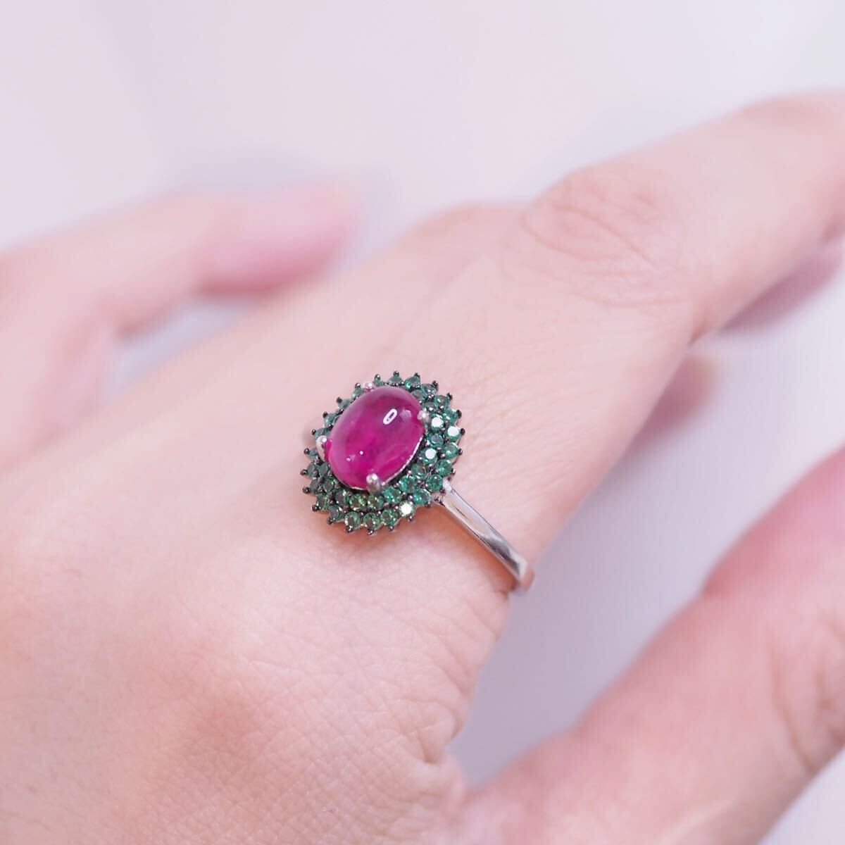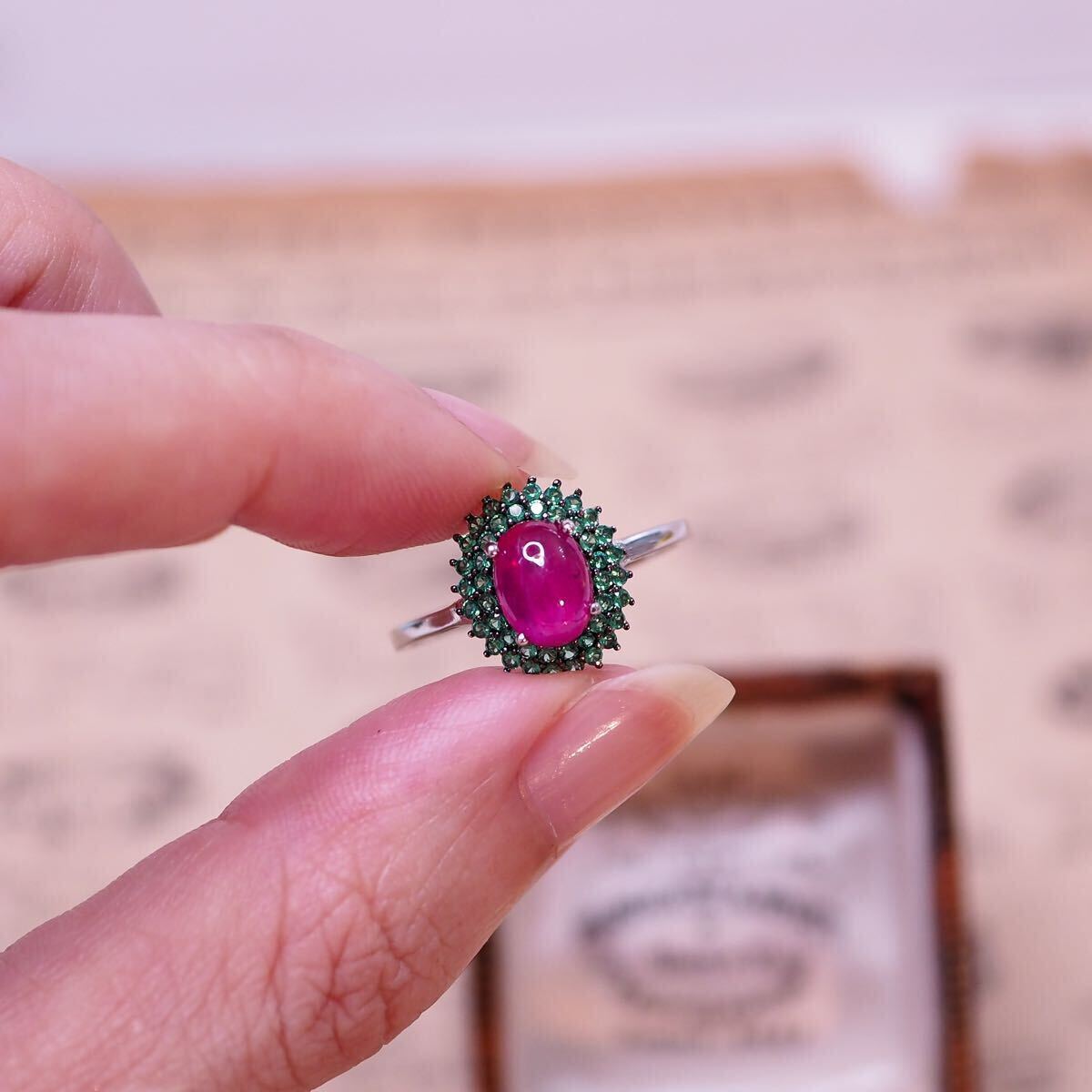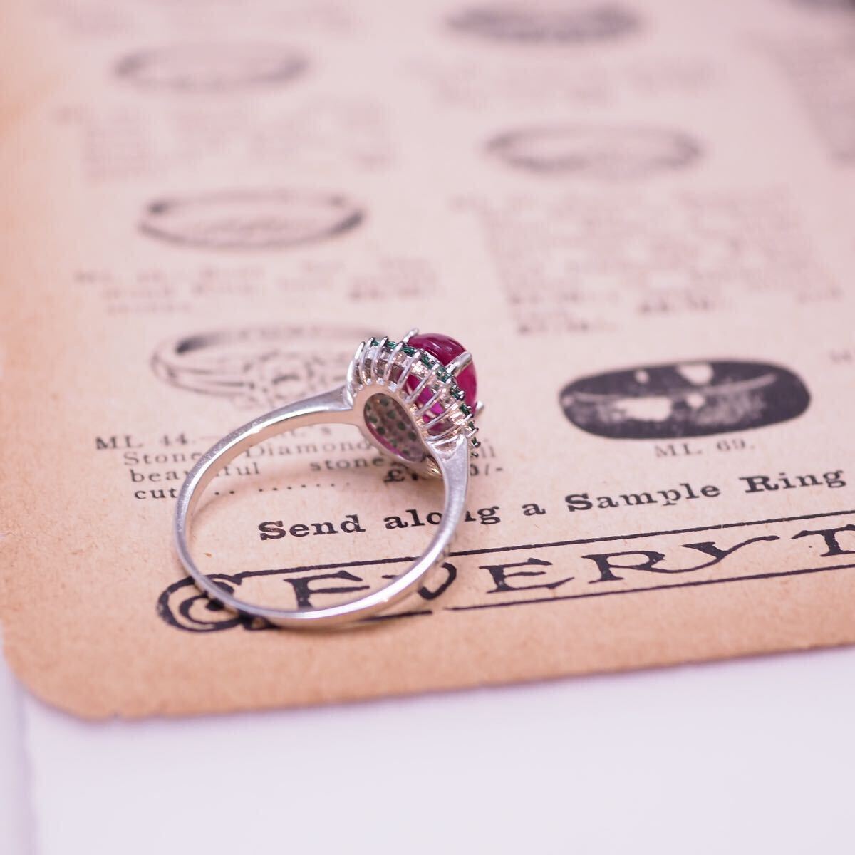 ウォーターメロンカラーのお仕立てのルビーリング。ぷるんとしたカボションカットの中には浮遊するインクルージョンが確認できます。周りをラウンドするフォレストグリーンのジュエル、カットの仕方でしょうか、キラッキラッとお指を動かすたびに煌びやかな輝きを見せてくれます。お見た目はエメラルドですが、輝き方はダイヤモンドのような反射をします。