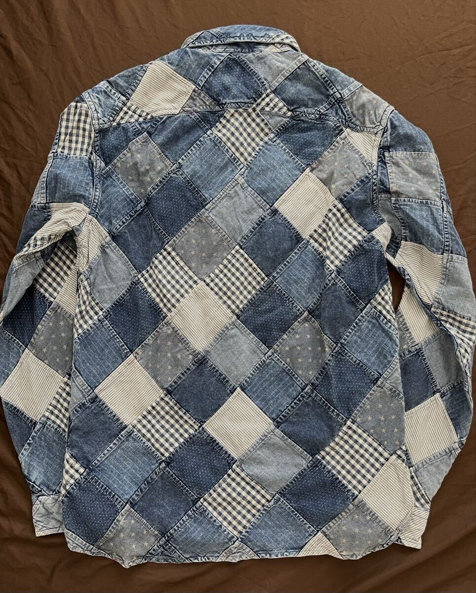RRL御馴染みのスクウェアカットのパッチワークではなく、斜転してダイアパッチワークにし、どこかアンティークなインディゴキャリコのキルトを彷彿とさせる仕上がりは圧巻で、RRLからリリースされたこの型のシャツはこのモデル一点のみという唯一無二な所にも惹かれます。