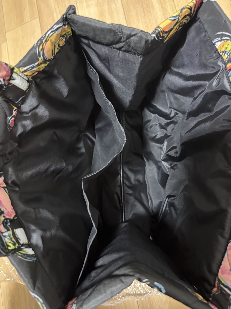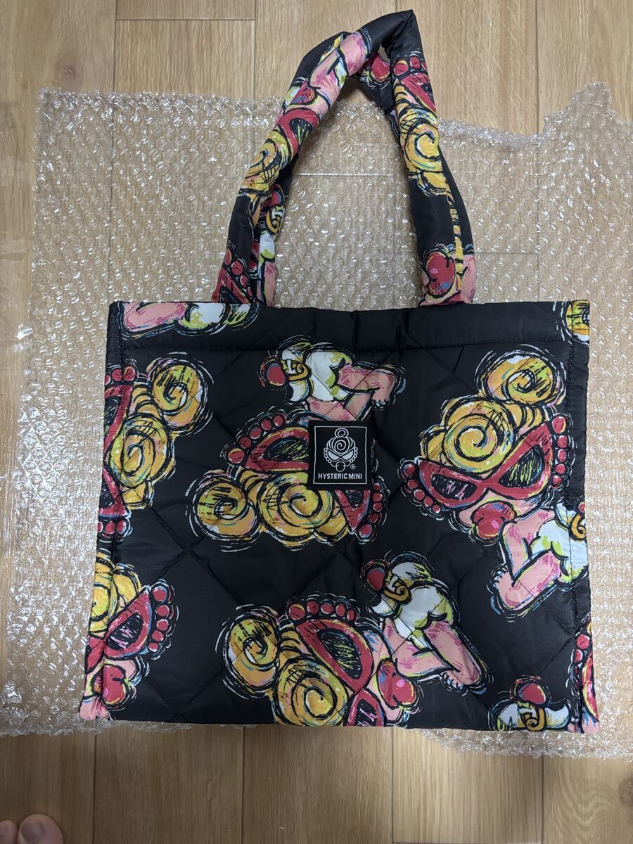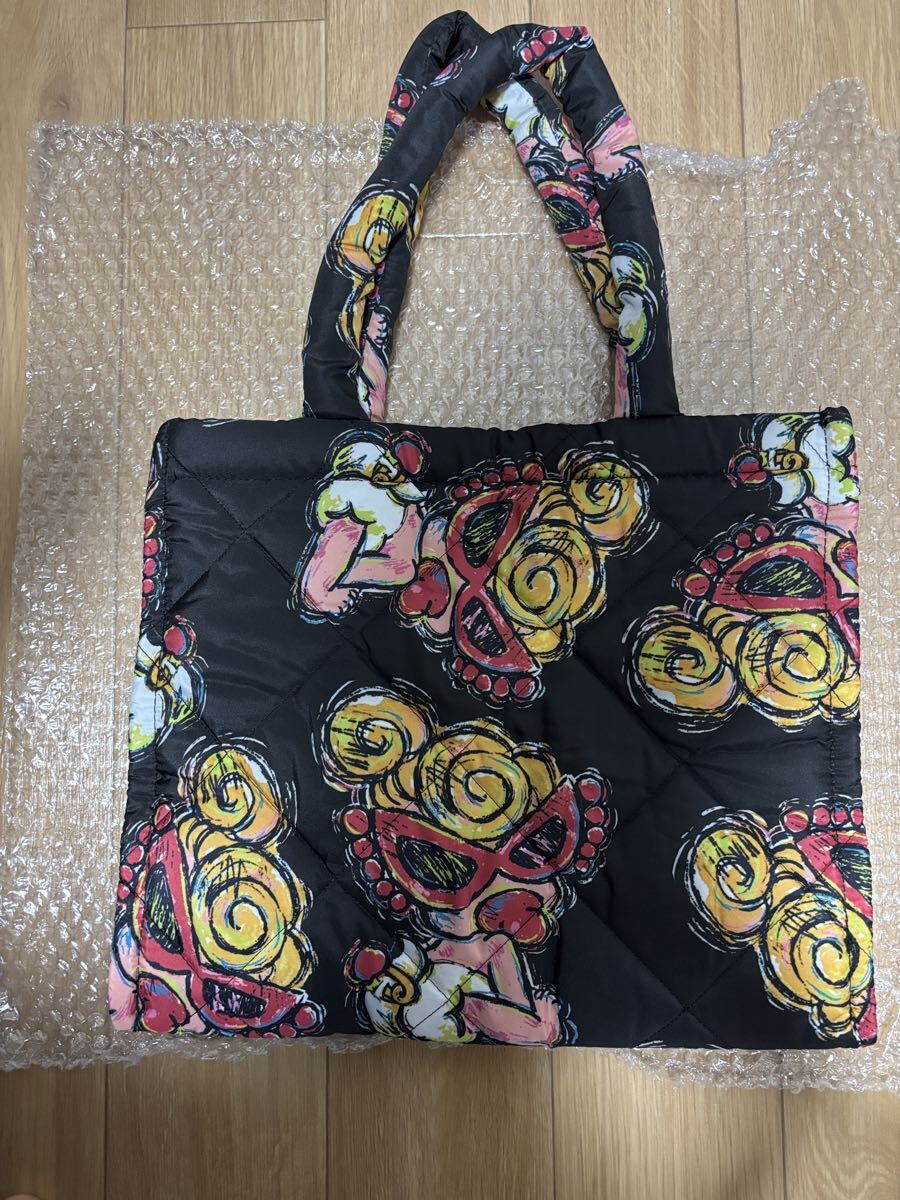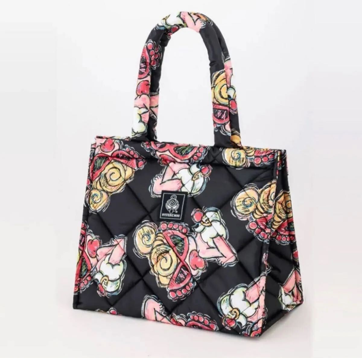 ふんわり軽いキルティング素材に、カラフルなアートプリントが映えるおしゃれなトートバッグです。