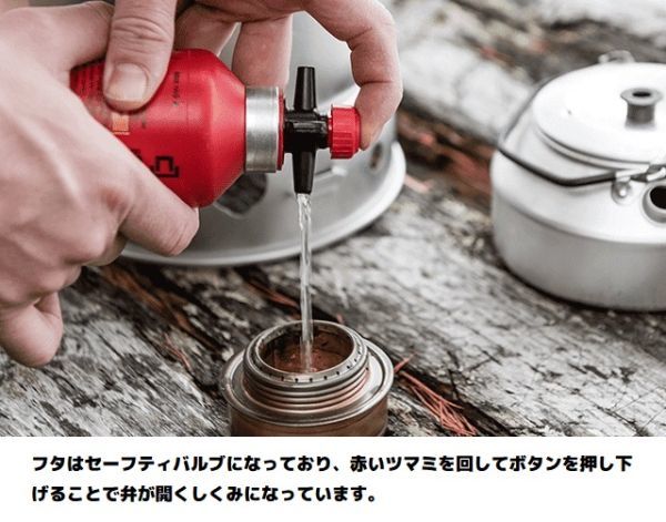 アルコール燃料専用のポリエチレン製フューエルボトルです。トランギアの燃料ボトルはセーフティーバルブを採用しており、キャップを取り外さなくてもボタンを押すだけで中に入っている燃料をストーブに注ぐことができる仕組みになっています。注ぎ口はアルコール燃料をストレスなく注げるよう細めに設計されています。様々な使用シーンのニーズに応えるべく、容量別に3種類のモデル展開となっています。