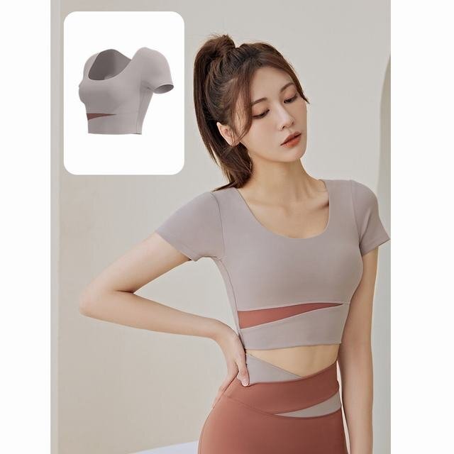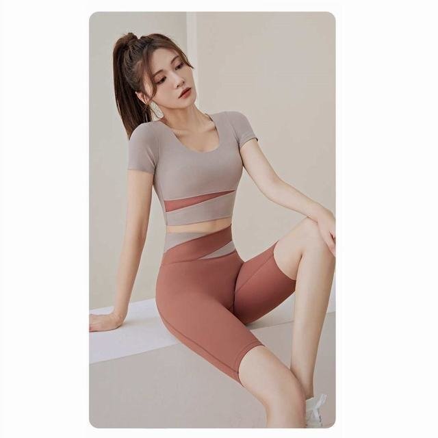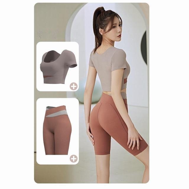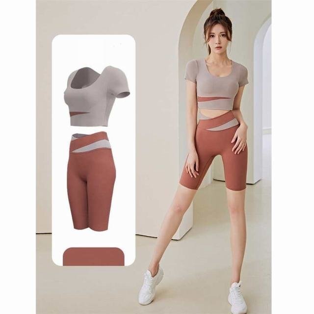 ヨガウェア レディース 上下セット 室内 おうちヨガ 体型カバー Uネック ショート丈トップス カップ付き ブラウン サイズ2XL