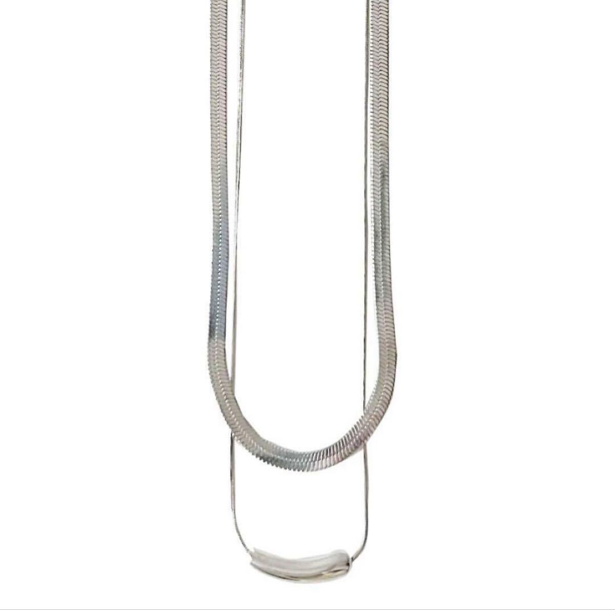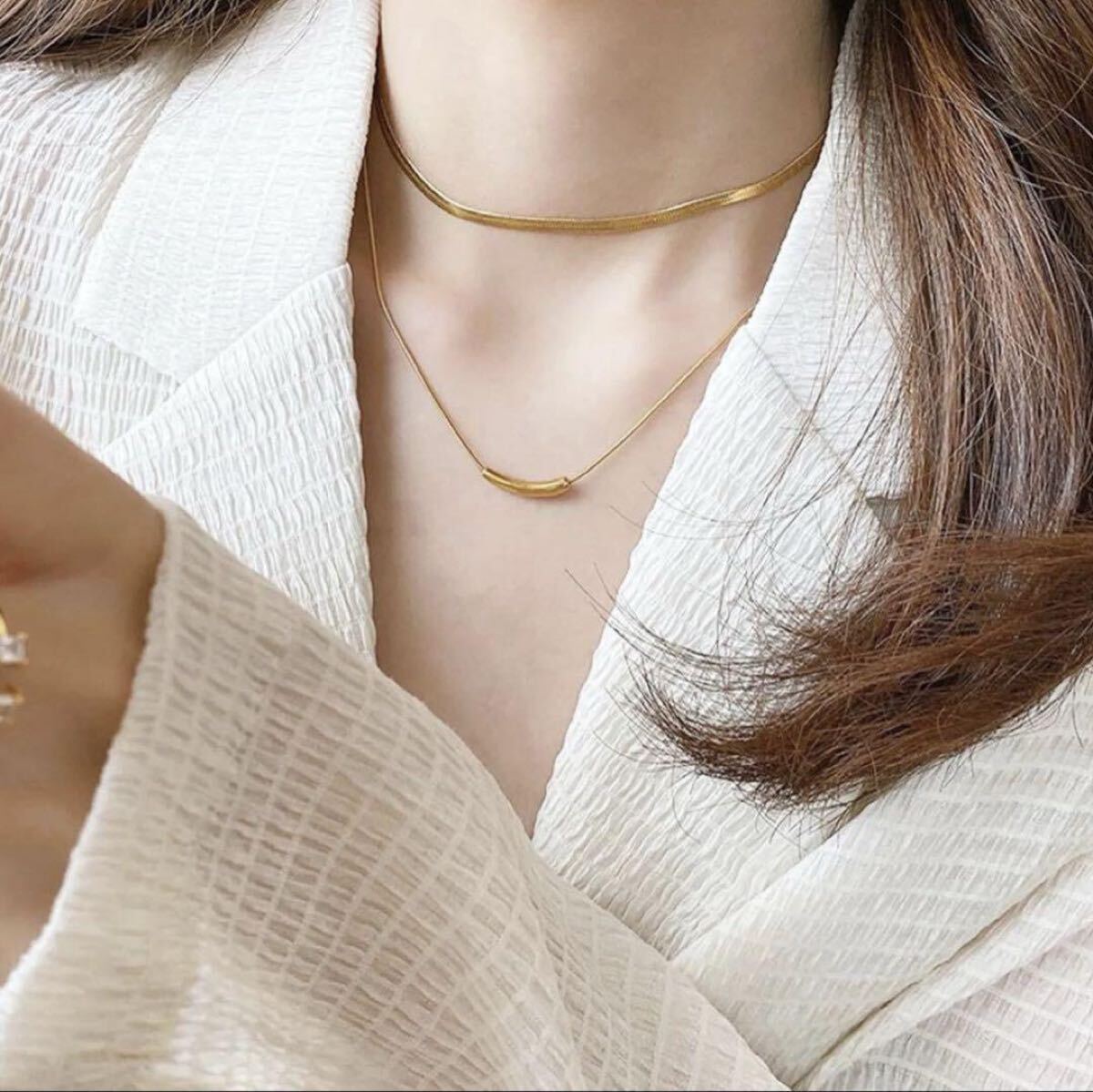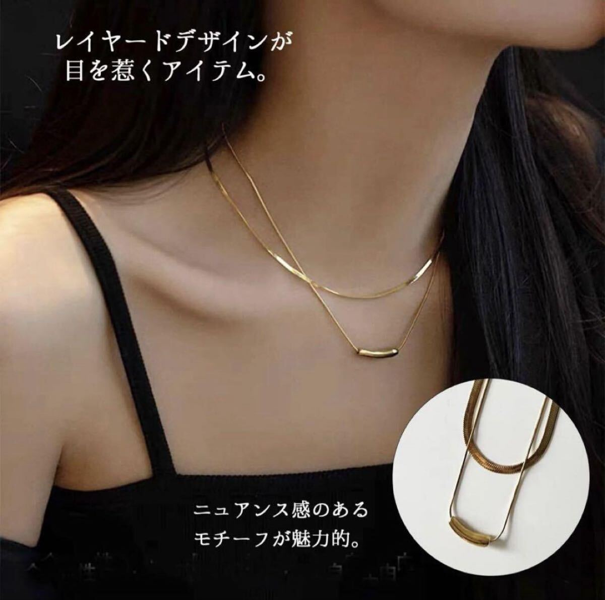 Lapimouのニュアンスデザインのネックレスです。細く華奢なチョーカーとモチーフネックレスが1つになったレイヤードスタイルを楽しめるアイテム。メタル調でオールシーズン使えるのも嬉しいポイントです。