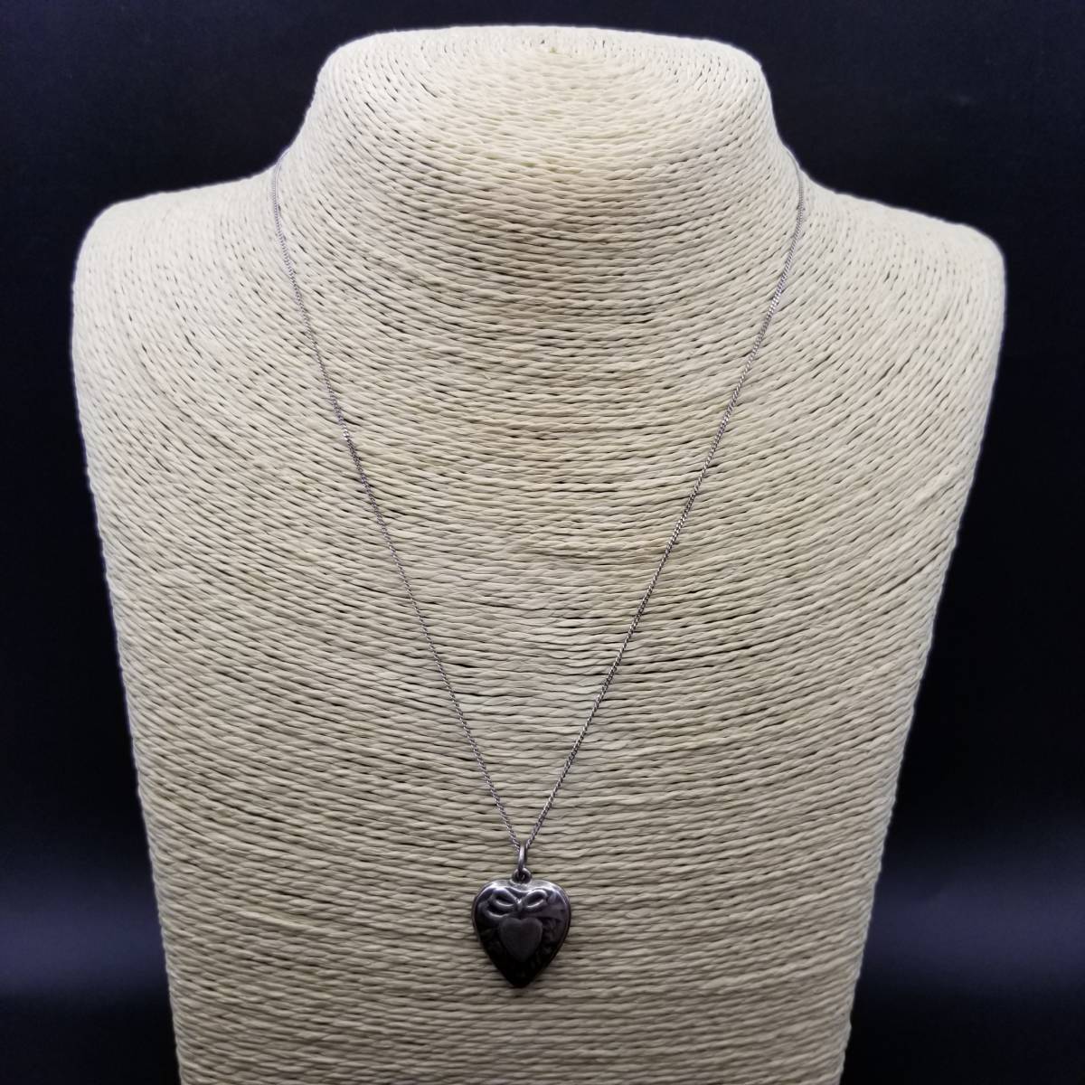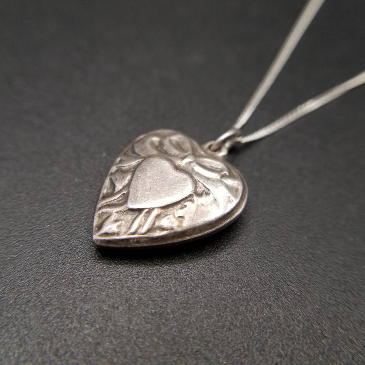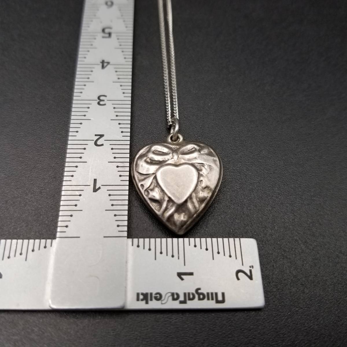 WWII期 ヴィンテージ スウィートハートジュエリー リボンをかけたハート 925 シルバー ネックレス ペンダント 銀 Puffy Heart Y12-G