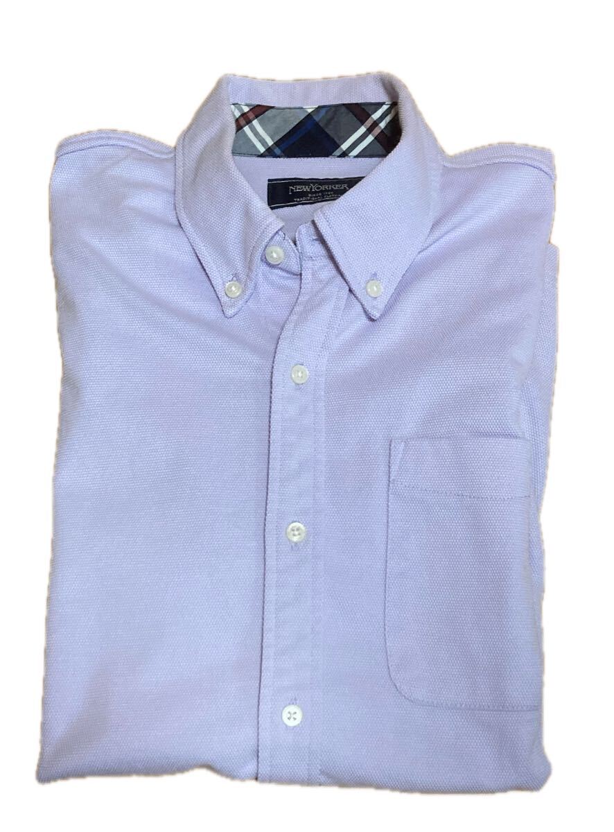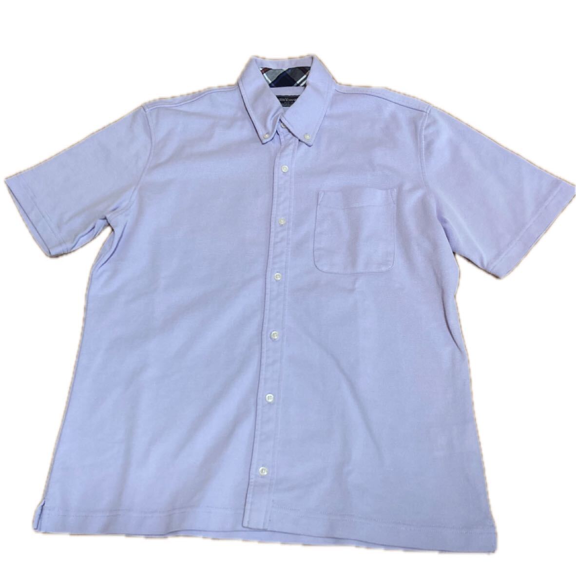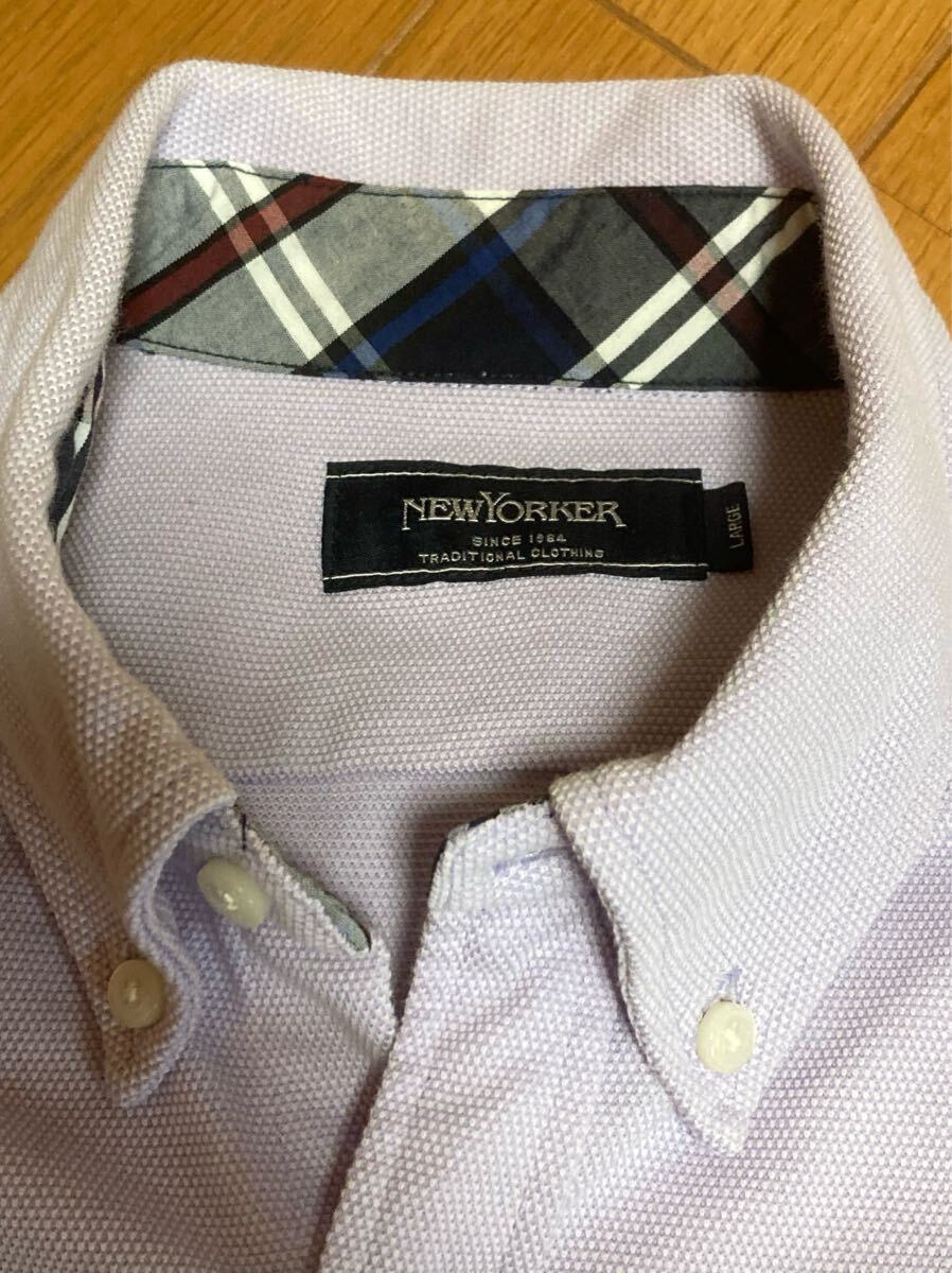 NEWYOKER ニューヨーカー 薄紫 半袖ボタンダウンシャツ サイズLの出品です。襟裏のチェック柄がさりげなくオシャレです。中古品をご理解いただきノークレームノーリターンにてお願いします。
