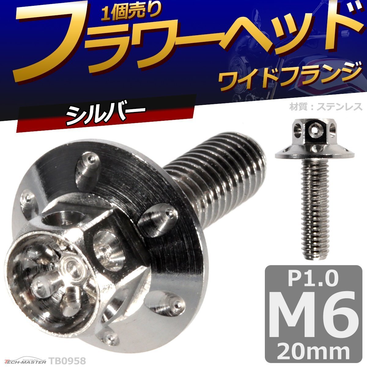 フラワーヘッド六角 ワイドフランジタイプの六角ボルトです。 六角ボルトは、エンジン周りや、タンク周りで使用されることがあるボルトです。 また、フラワーヘッド六角ボルトは六角ボルトに、 大きく肉抜き加工し、取り付けたときに六角の中にフラワーの模様が見えるドレスアップに最適なボルト! ボルトの紛失時やドレスアップに最適なボルトです。 |
