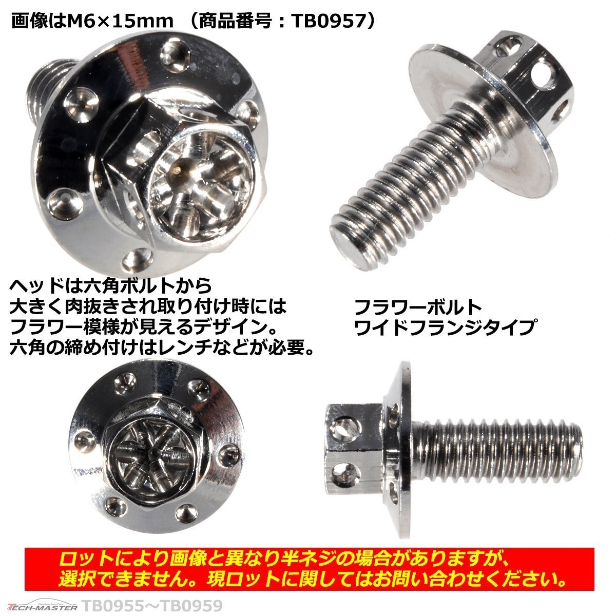 フラワーヘッド六角ボルト ワイドフランジタイプ (フラワーヘッドボルト) 数量:1個売り 材質:ステンレス 頭部穴形状:六角ナット型 適合工具:レンチなど(肉抜きはされていますが、特殊な工具は不要) 商品サイズ:M6×20mm P1.0(詳細は画像に掲載) ネジの長さ:20mm(告知なしで変更の時あり、詳細のサイズが必要な場合は要問い合わせ。ロットにより全ネジ、半ネジが異なりますが、選ぶことができません。) 適合車種:汎用タイプ。サイズ等でご判断ください。なお、適合車種に関しての回答は致しておりません。 商品カラー:シルバー ※サイズやカラーごとに価格が異なる為、購入後の商品の変更はできません。 また、ご購入数しかお取引ができません。 数量以上ご必要の場合は、ご入札前にご質問ください。 在庫がございましたら別途出品させていただきます。 |