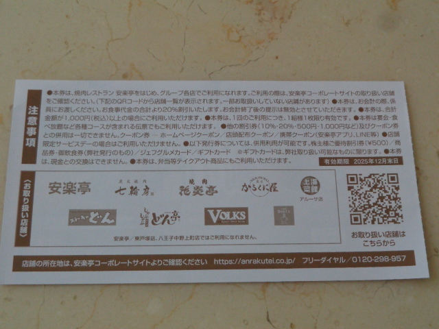 安楽亭★株主優待券★20%割引券★2025年/12月/末日★VOLKS どん亭 七輪房///