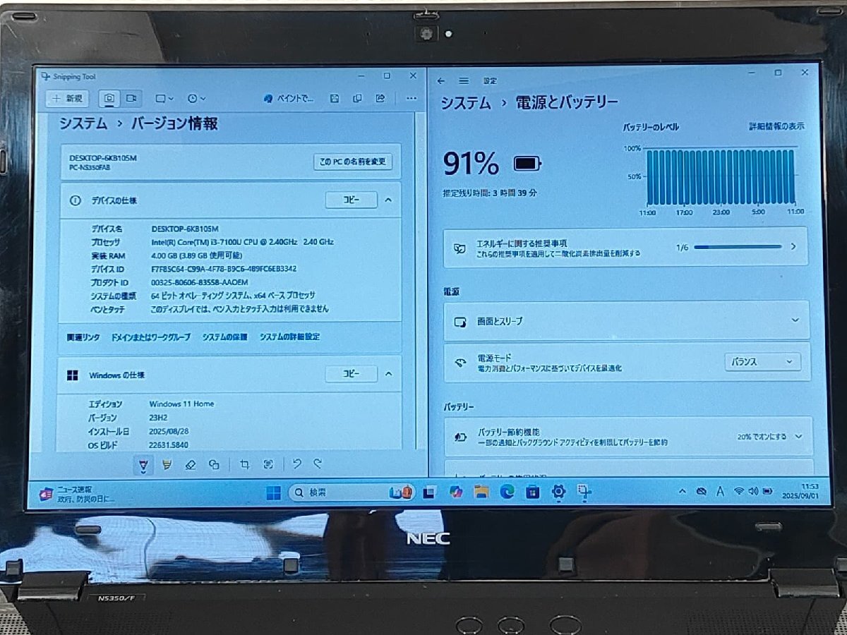 ●【難あり】NEC Lavie NS350/F PC-NS350FAB / i3-7100U / 4GBメモリ / 1TB HDD / 15.6型 / Windows 11 Home【 ノートパソコンITS JAPAN 】