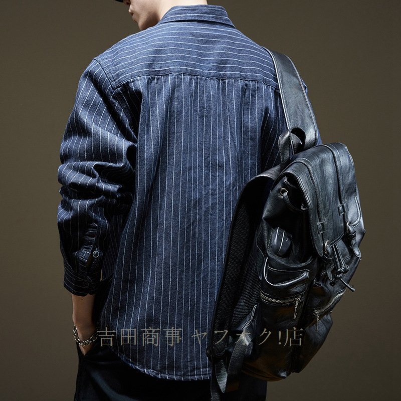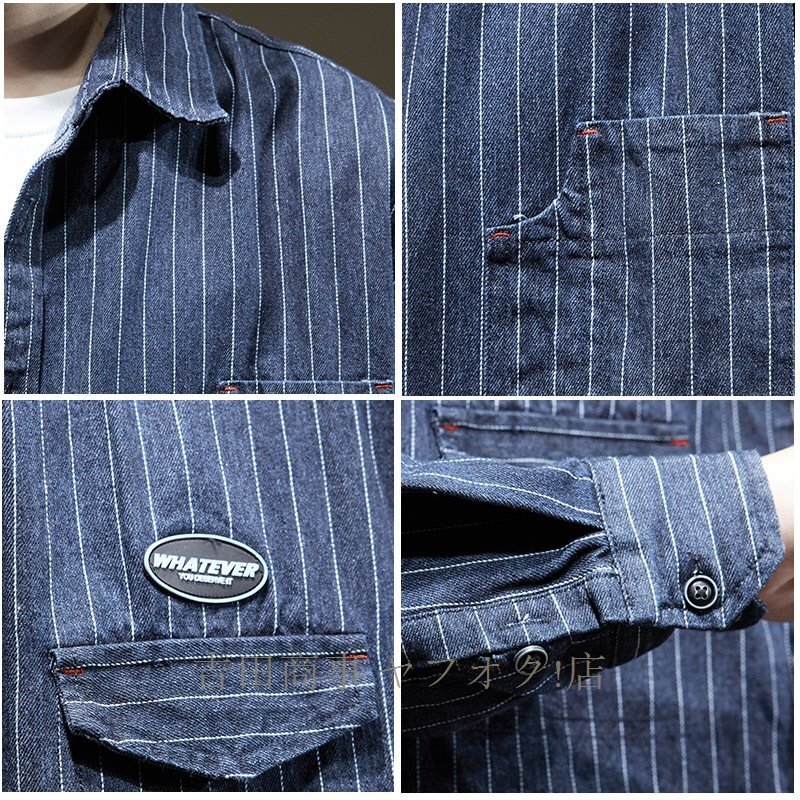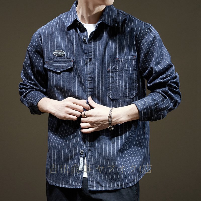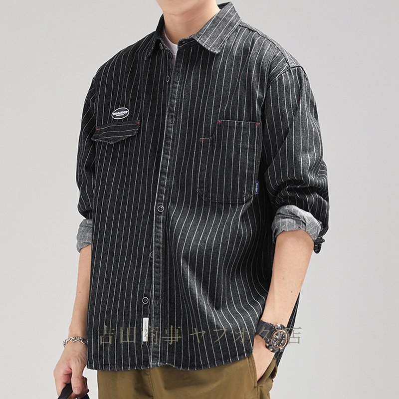 ☆新品お洒落?デニムシャツ ウエスタンシャツ 長袖ストライプシャツ メンズ 開襟 ワークシャツ おしゃれ 黒