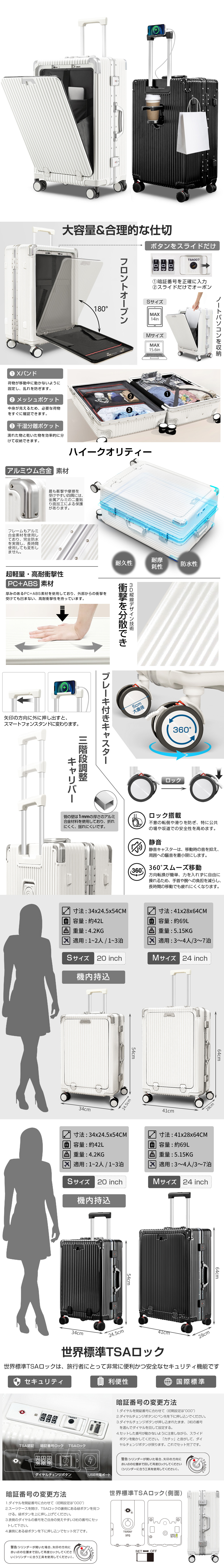 フロントオープンデザインを採用、スマートフォン、モバイルバッテリー、タブレット、ノートパソコン、旅先で頻繁に取り出す傘、パスポート、帽子、本などを収納可能。他の一般的なフロントオープンのジッパータイプのスーツケースとは異なり、このスーツケースはワンタッチでロックを解除できます。手でスライドスイッチを操作するだけで開くことができます。持ち手部分にはダイヤルロックがあり、前面開口部分が不要な場合はロックしておくことができ、必要なときに正しいパスワードを入力するとロック解除が可能です。注意:Sサイズには最大14インチのノートパソコン、Mサイズには最大15.6インチのノートパソコンが収納可能です。