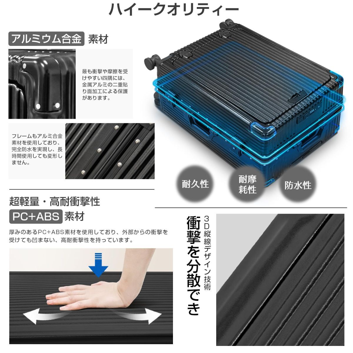 ブレーキ付きの超静音キャスターを採用、揺れる車両内でも固定された位置に置くことができ、労力を節約します。最も衝撃を受けやすい4つの角には、金属製のコーナープロテクターを使用しており、金属素材は硬く、強い衝撃を受けても凹みやひび割れが発生しません。スーツケースの両側が合わさる部分にはアルミフレームを使用しており、変形しにくく、雨天時でも水がケース内部に侵入しません。さらに、スーツケースの側面には2つのダイヤル式ロックがあり、安全性が二重に保証されています。
