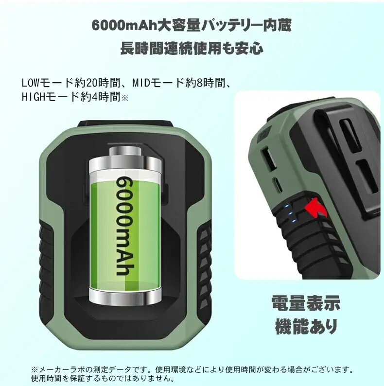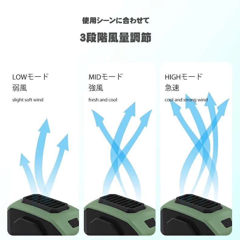 工事現場、農作業、野外作業、釣り、バーベキューなどのアウトドアはもちろん、倉庫、工場などの室内活動にもお薦めです。低モードは涼しい風量が、高モードが強い風量を持っています。