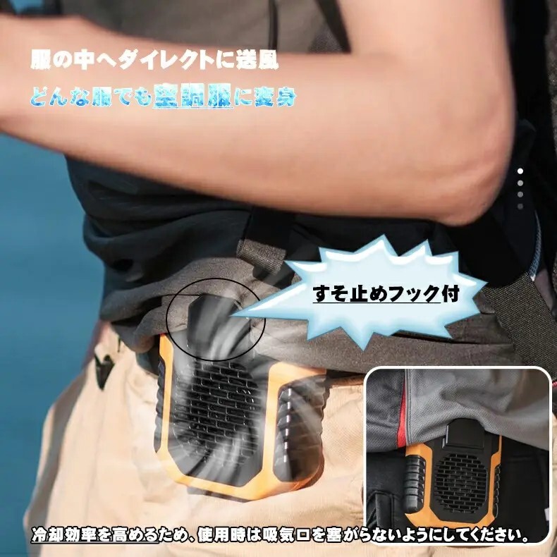 腰掛け扇風機:クリップをベルトに付けるだけで、服内に循環送風、背中がさわやか。