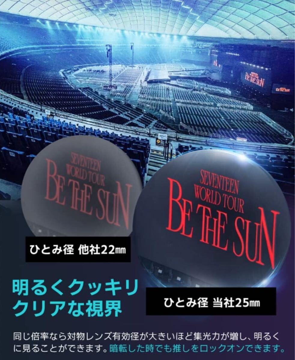 【どの席でも満足に推しを見れる】コンサートで少しでも近くから尊い推しを眺めたい。そんな願いを叶える双眼鏡が登場!アリーナやドームなどの大きい会場で手持ちの双眼鏡で手ブレを気にせず見れる倍率、それが12倍です。分かりやすく言うと、100メートル先の推しを10メートルの距離から見ている感覚です。10メートル先だと88センチの距離になります!」