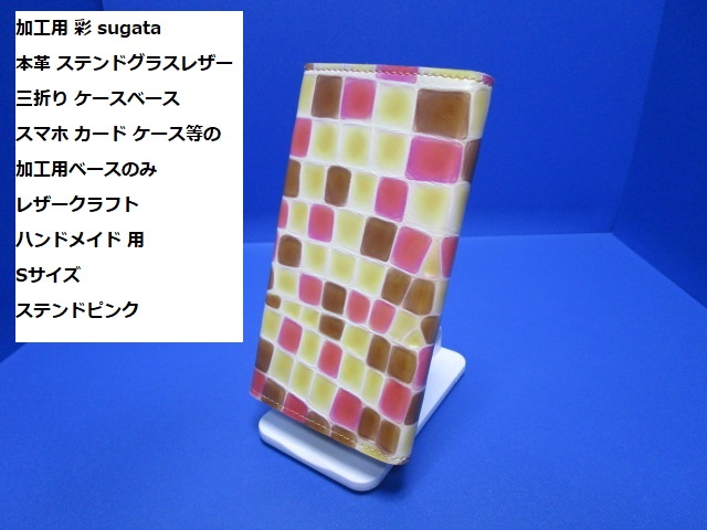 加工用 彩 sugata 本革 ステンドグラスレザー 三折り ケースベース スマホ カード ケース等の加工用ベースのみ Sサイズ ステンドピンク ★y