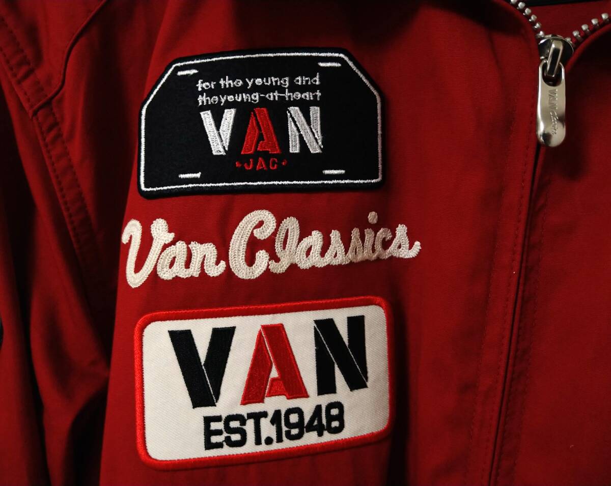 ◇VAN JACのスイングトップに、右胸はナンバープレート型とヨコ型ロゴマークの2枚、右腕は定番の丸VANとヘルメットの2枚のワッペンを追加してカスタマイズしました。左胸・左肩のワッペンと右胸の刺繍は購入当初の仕様です。