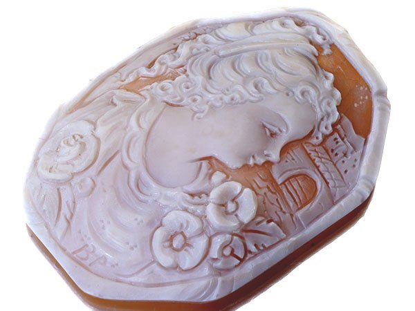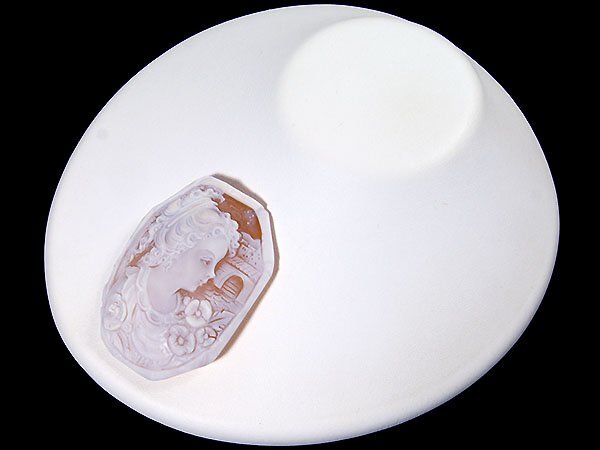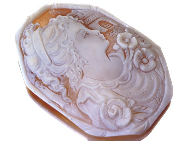 綺麗な女性と花を繊細に彫刻で演出した、素晴らしい高級シェルカメオルースです!